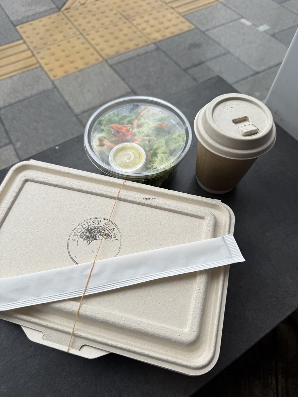 Vegan option for bento box and coffee milk, you also get a complimentary small cake/cookie with your coffee order. Best coffee I've had in Japan so far! The taco beans and rice box was made on the spot, comes with a side salad, and was tasty but not extremely flavourful. The ready-made boxes were not vegan, maybe there was a vegetarian option, not sure. Friendly and patient staff, some know a little English. Takeaway place, they appreciate you bringing your own bag. We came back several times since we lived nearby. They also sell organic oat milk and some produce.