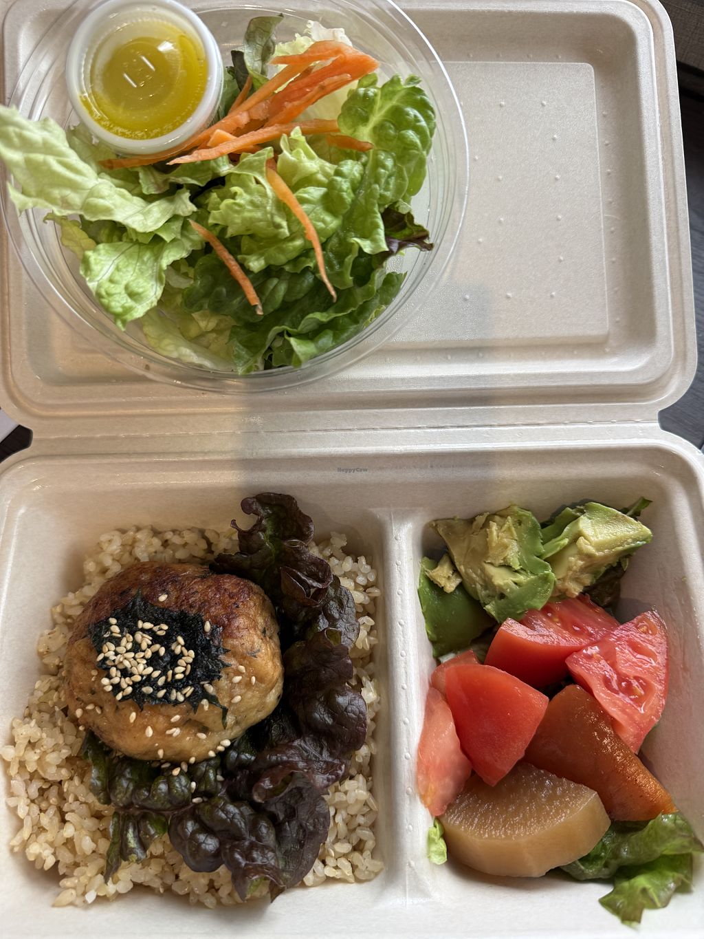 Cute corner business. To-go only (bring your own bag). Soy and oat milk options. I ordered the tofu hamburger meal with brown rice. The lettuce and veggies were so fresh and delicious. Brown rice cooked perfectly and the tofu hamburger was… I thought vegan (based on the name tofu) but looking back at the menu I might have made a big error in judgment 😭