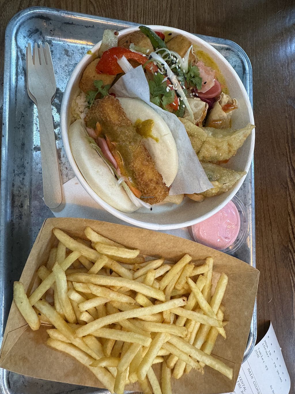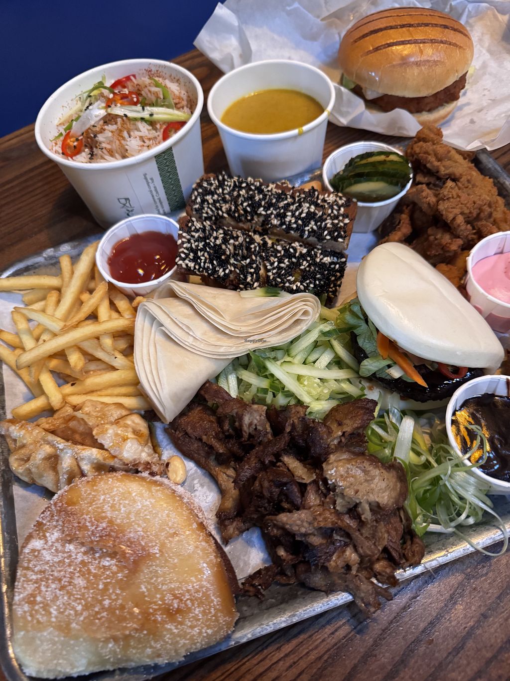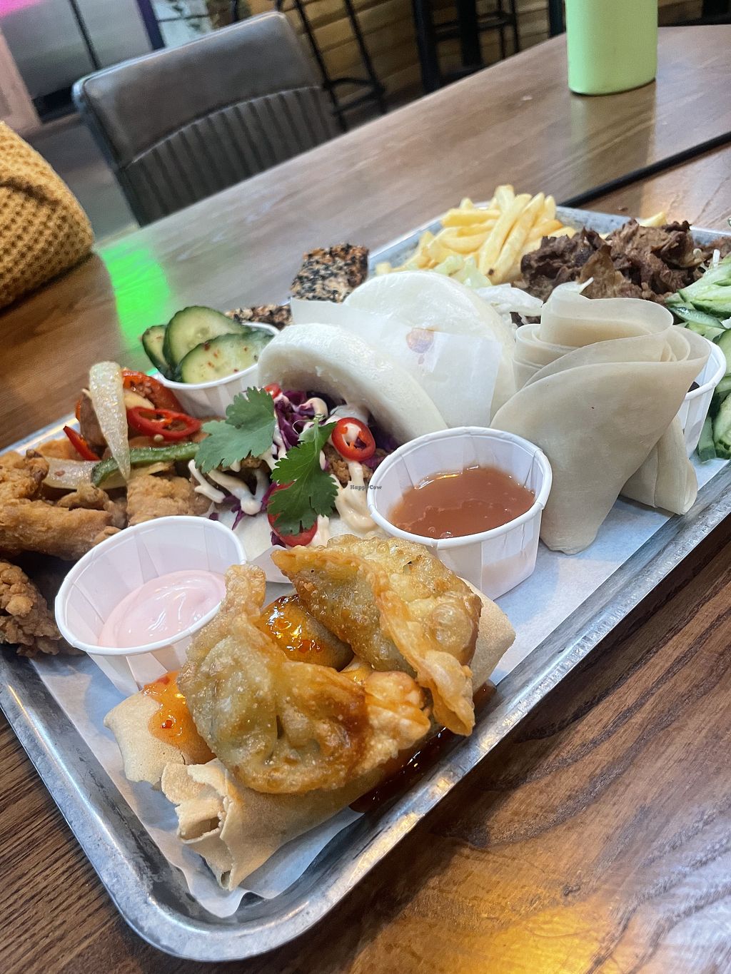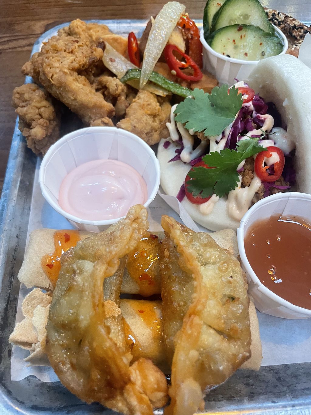 Sweet and sour bowl, spring rolls, popcorn tofu, original wings, chick…