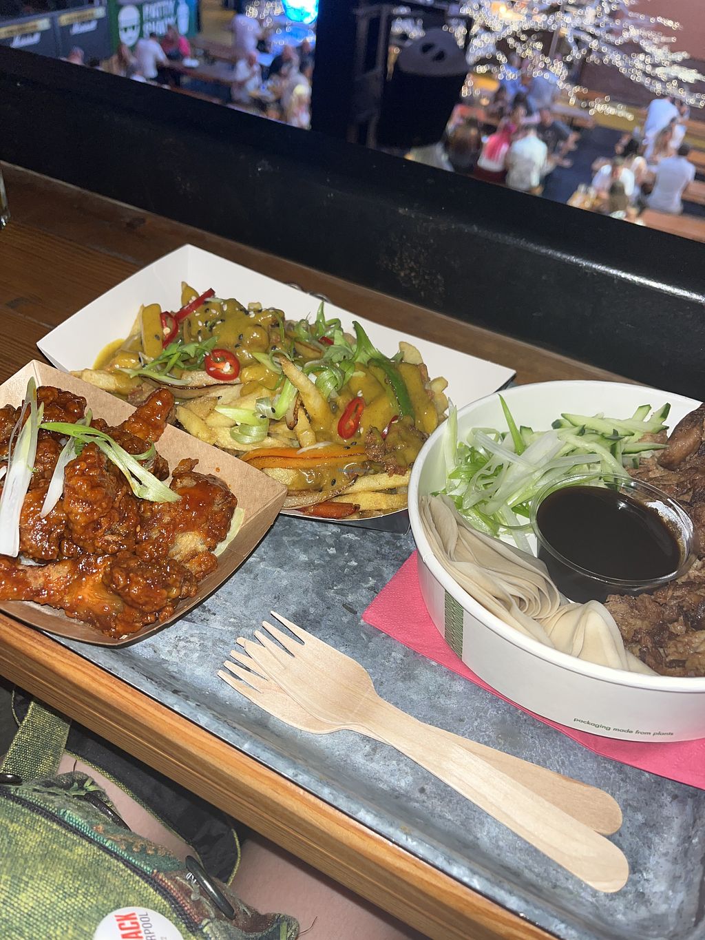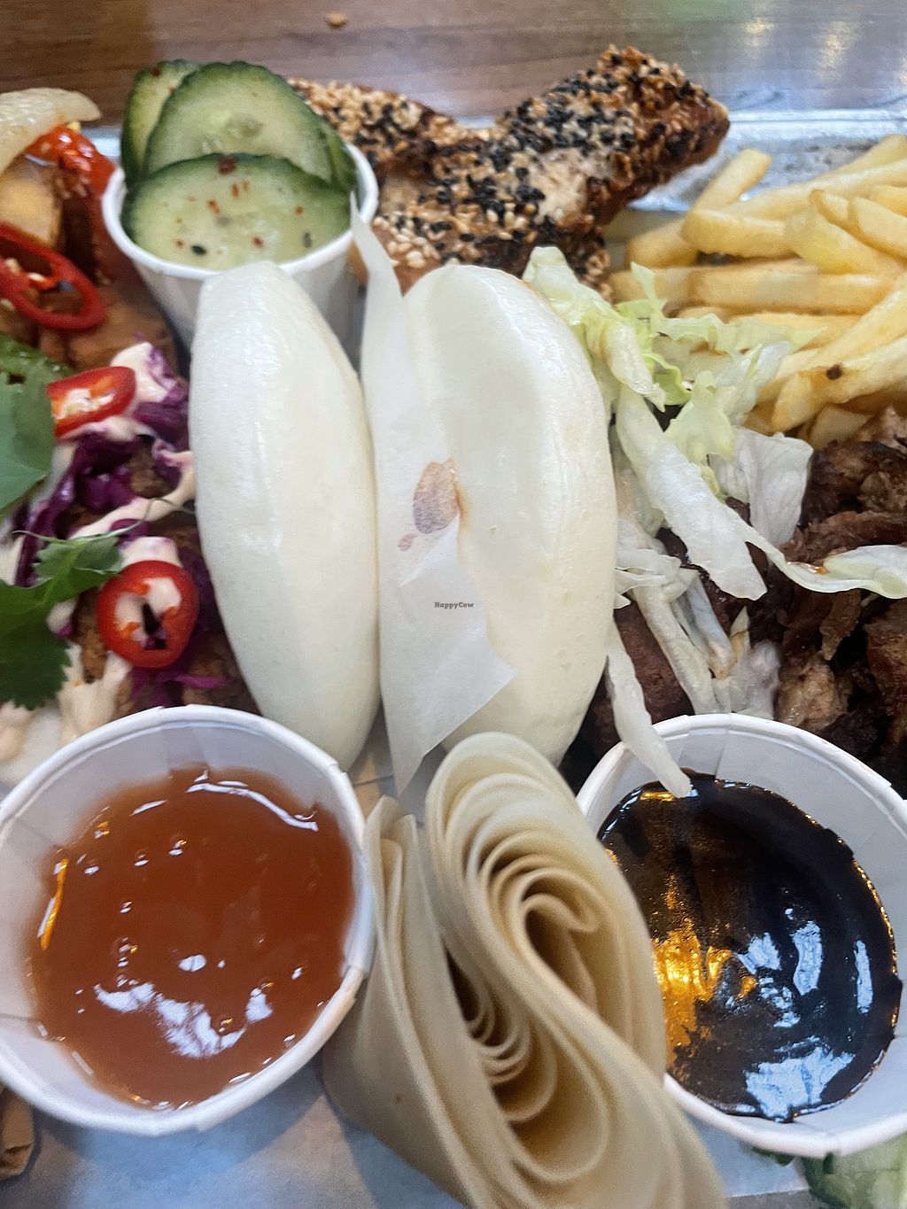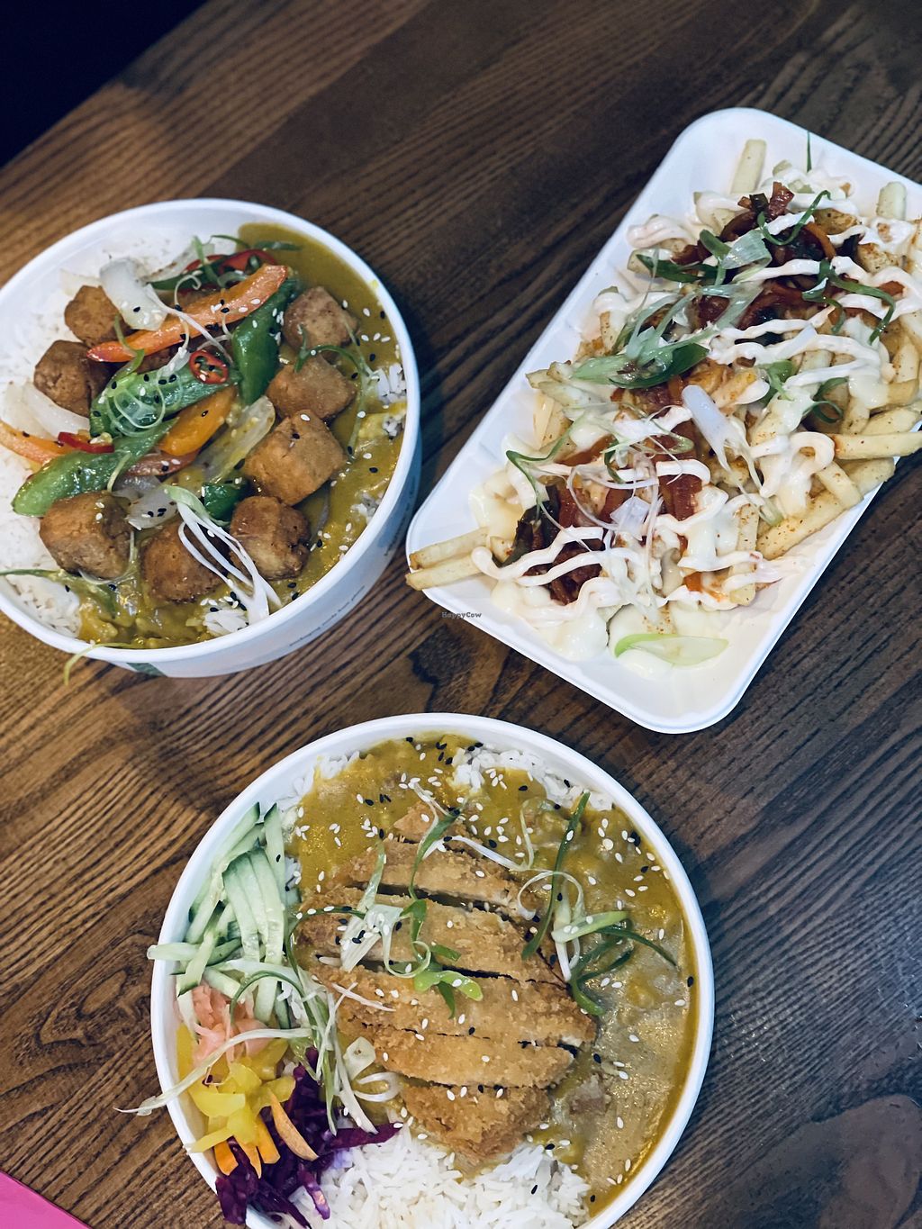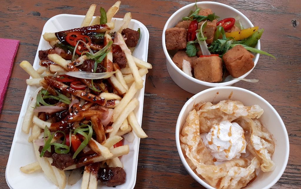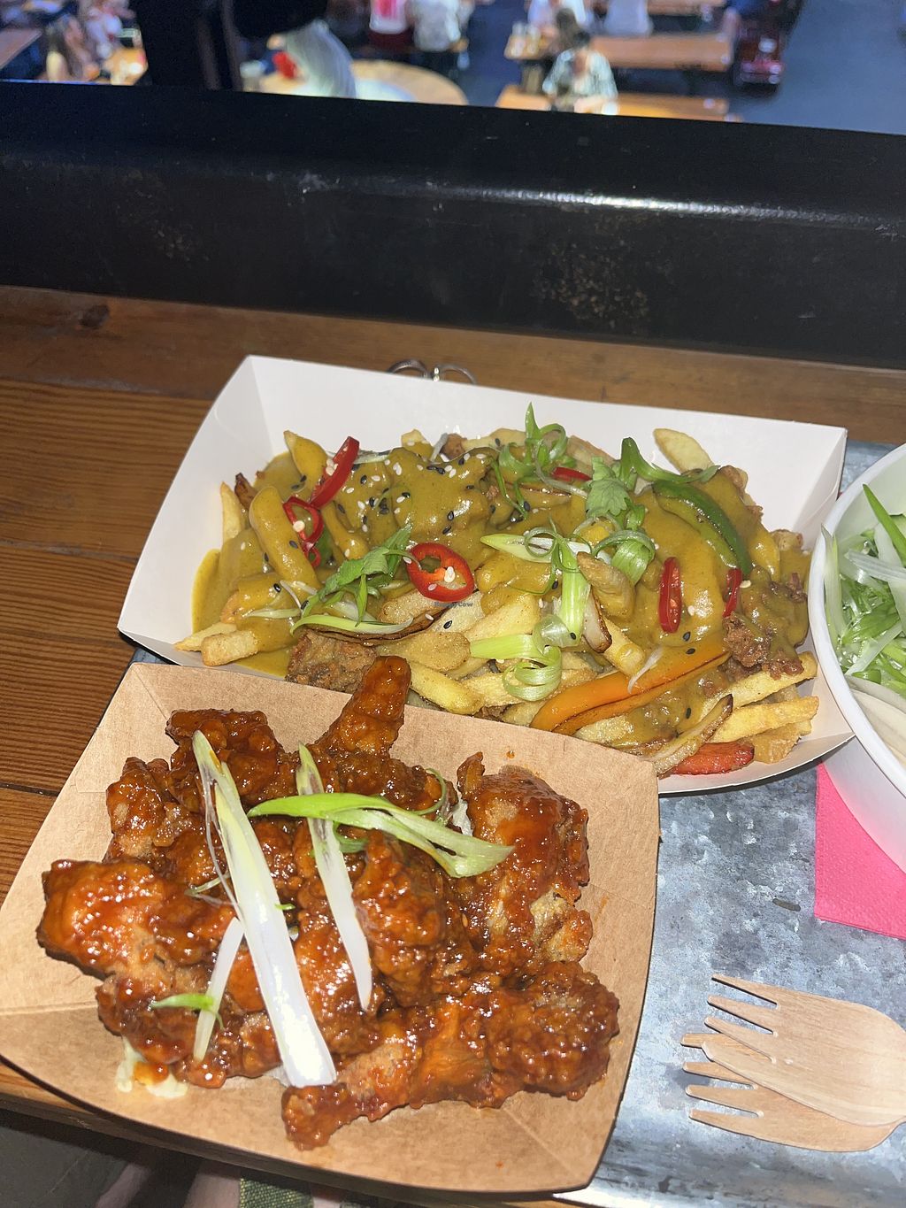 Sweet and sour bowl, spring rolls, popcorn tofu, original wings, chick…