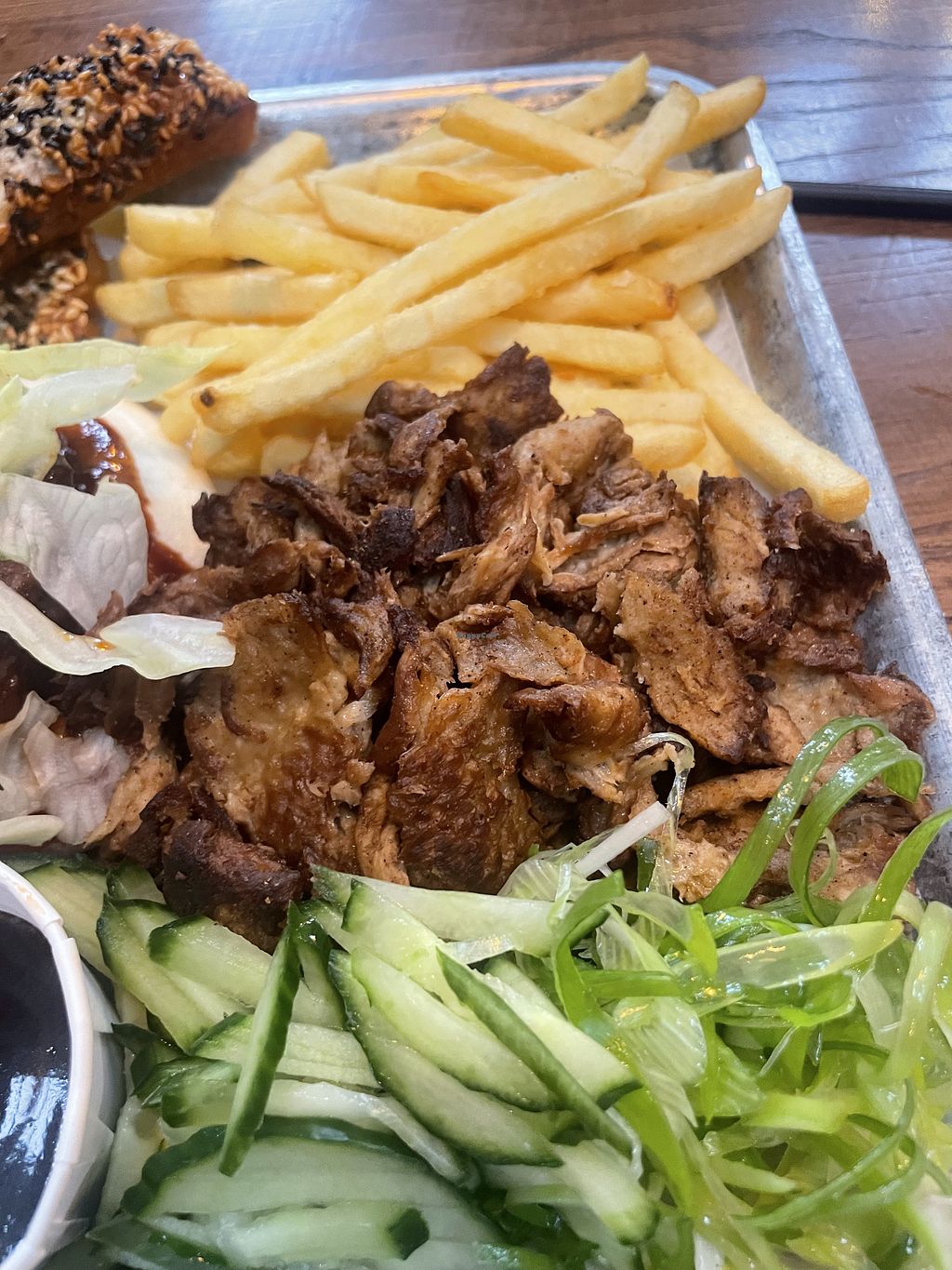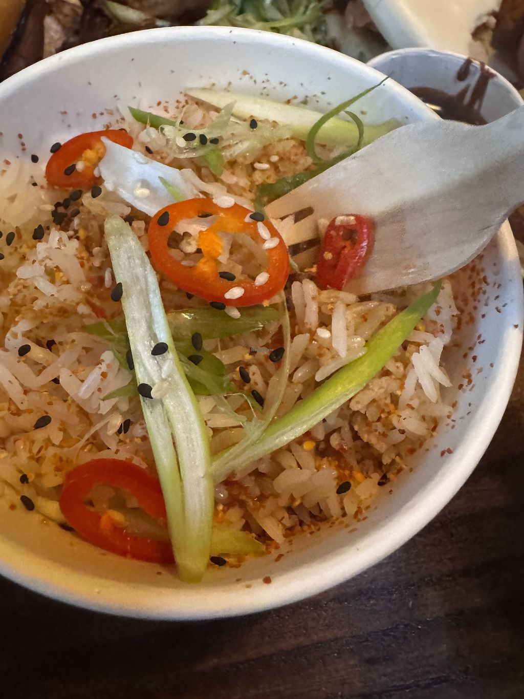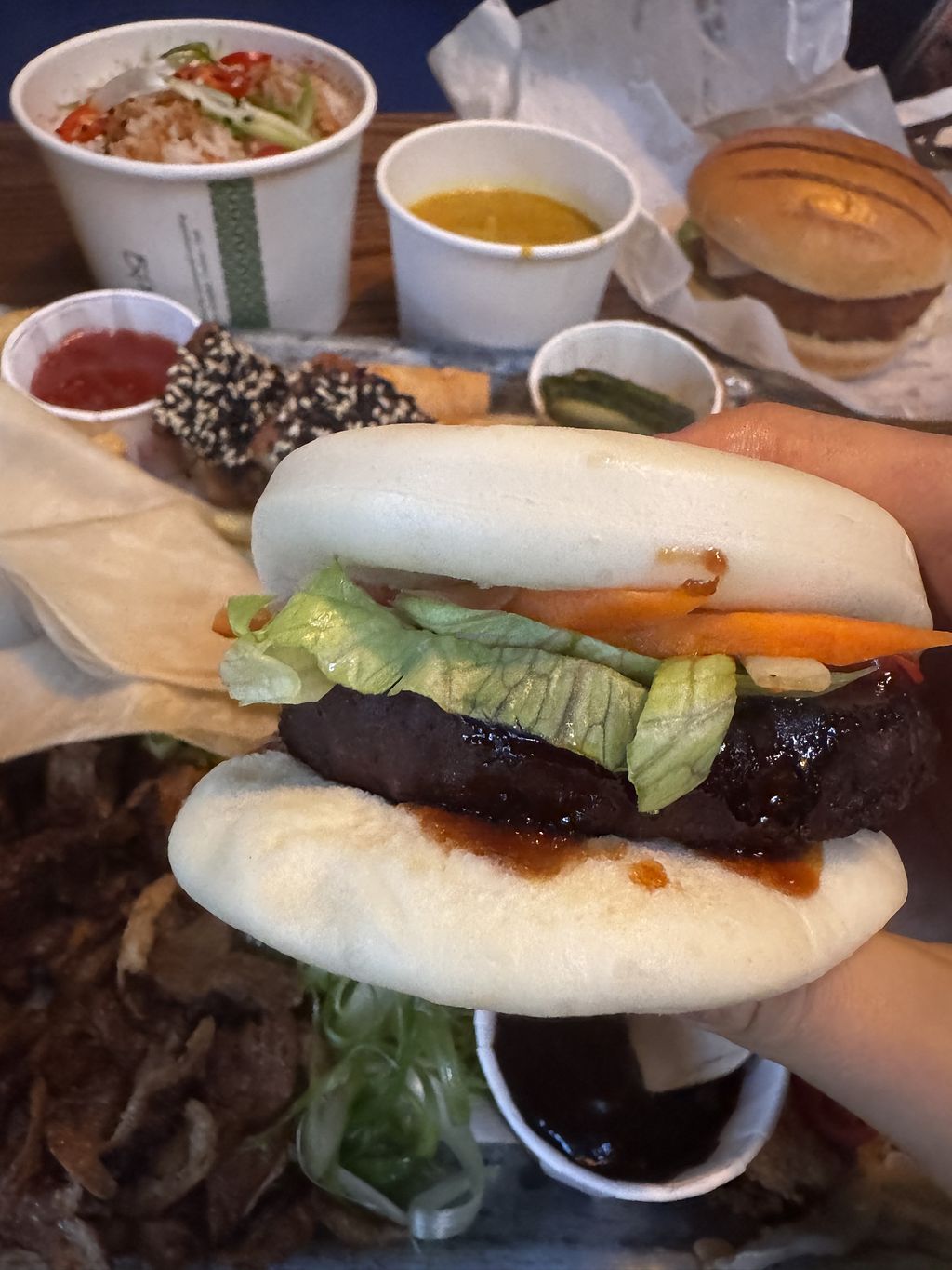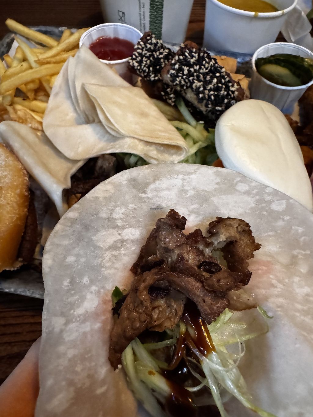 Sweet and sour bowl, spring rolls, popcorn tofu, original wings, chick…