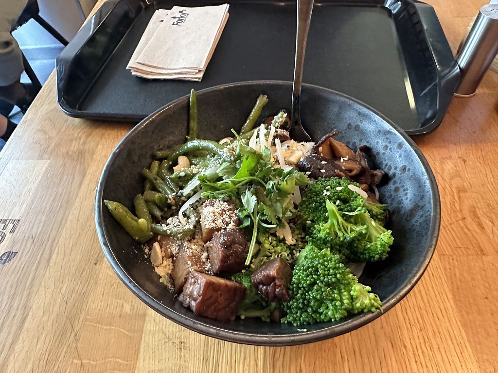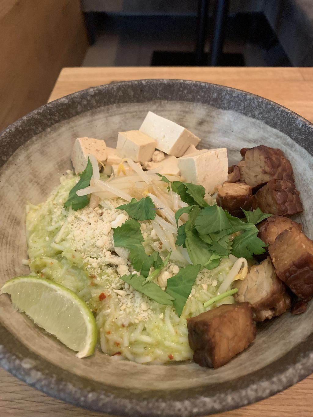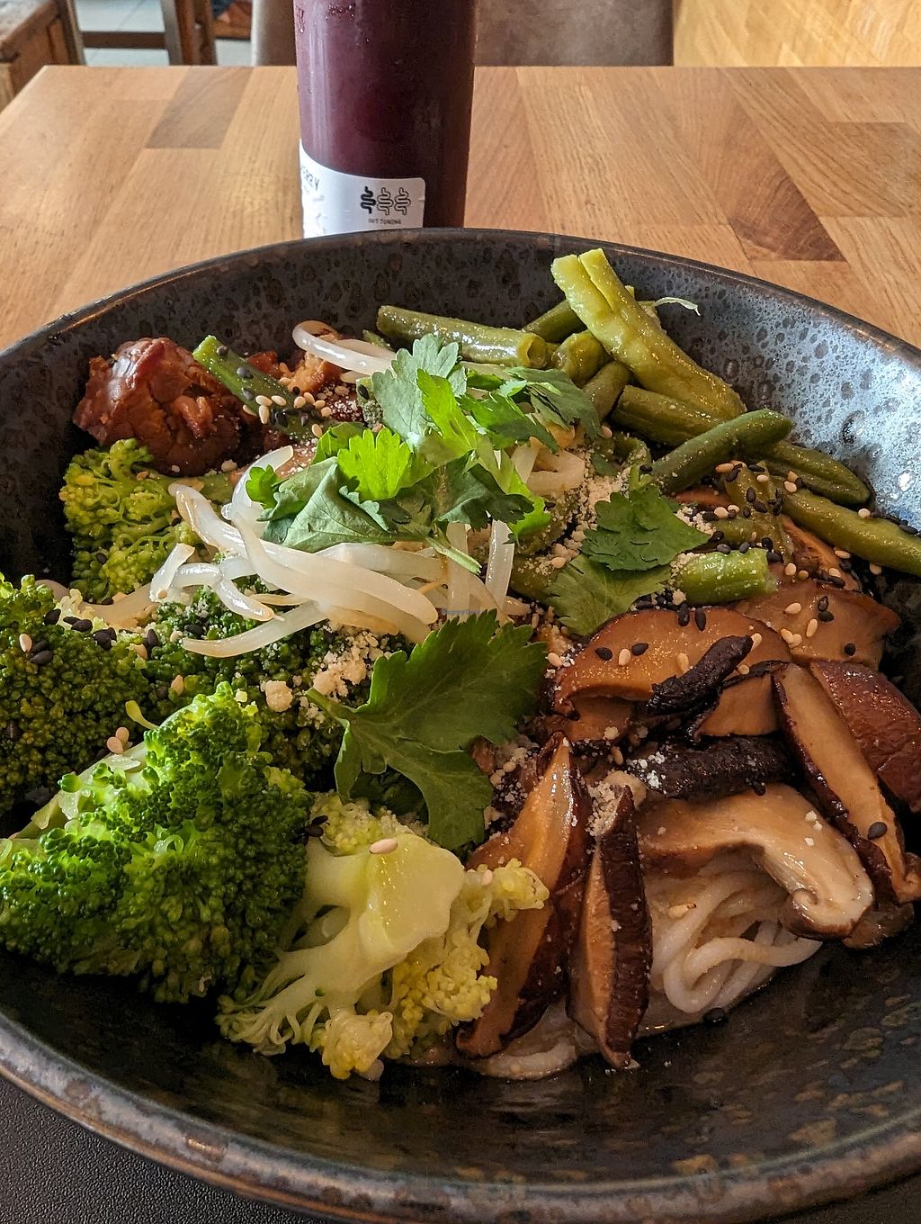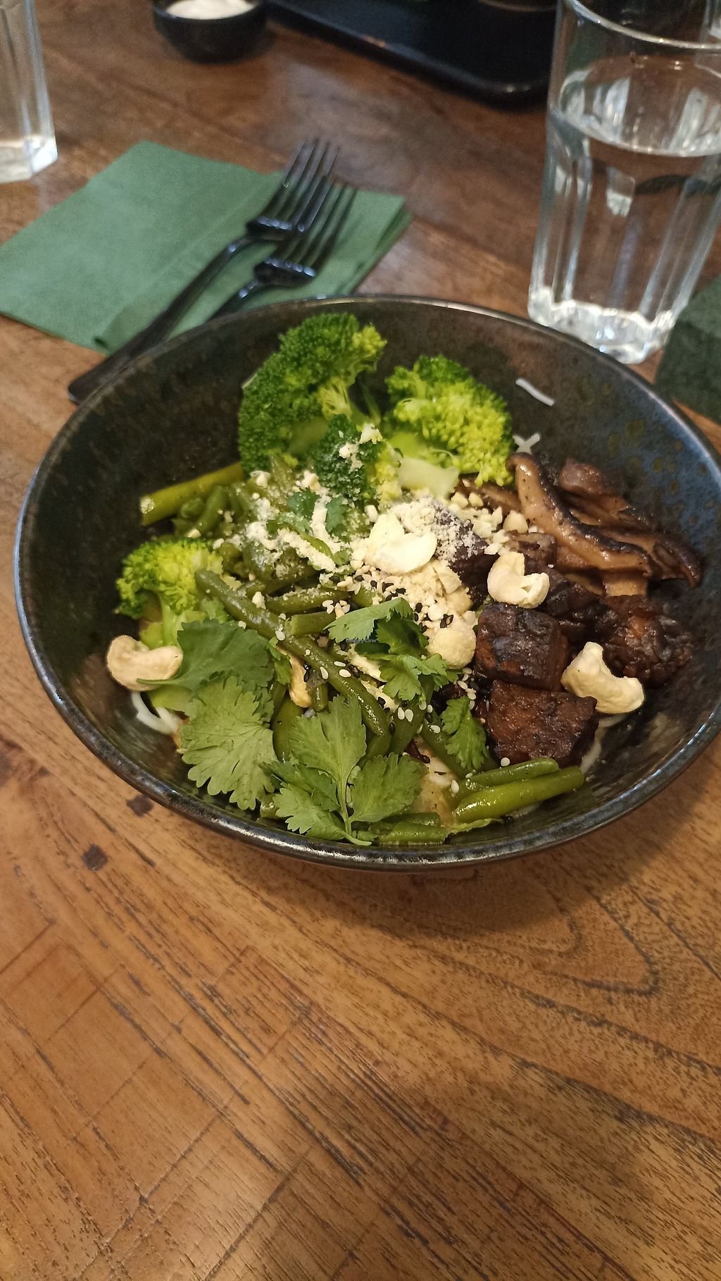 Buddha broccoli (rice noodles, marinated tempeh, broccoli, shiitake mu…