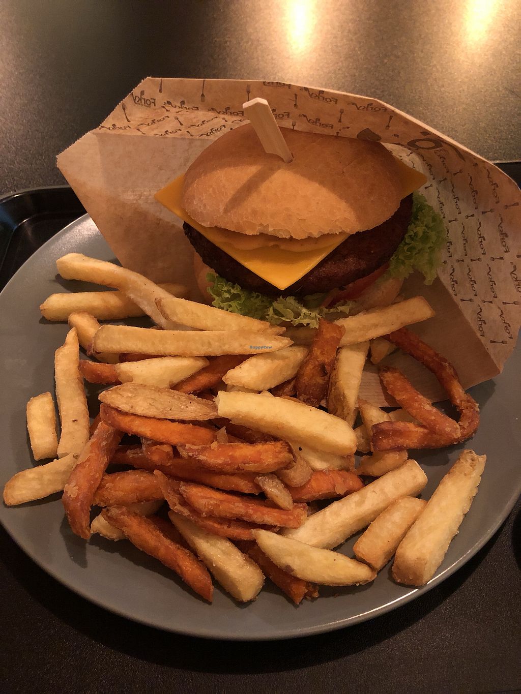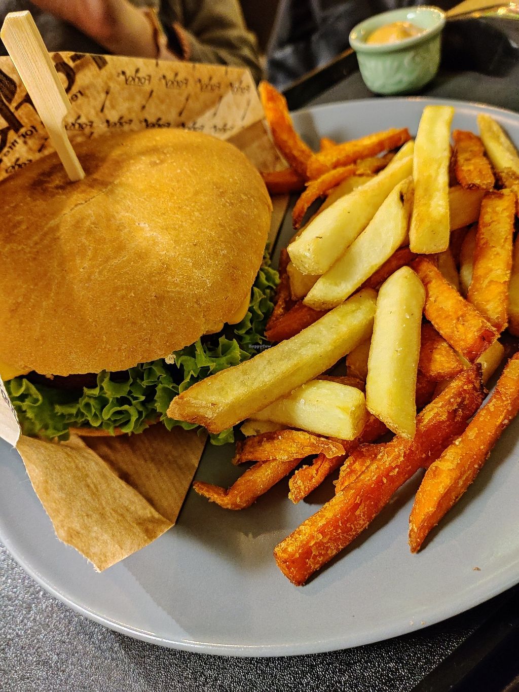 Cheeze burger with regular and sweet potato fries
