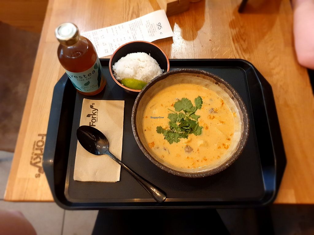 Spicy Thai curry with rice. The bottle contains cool green tea.