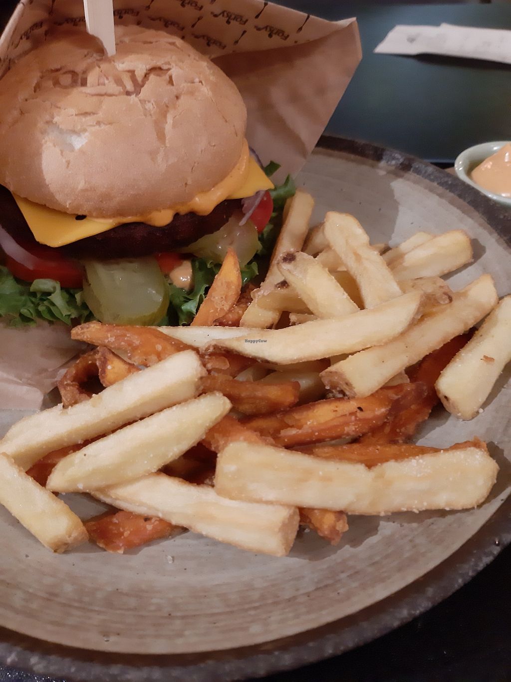 Cheeze Burger with sweet potato and potato fries, spicy sauce and extr…