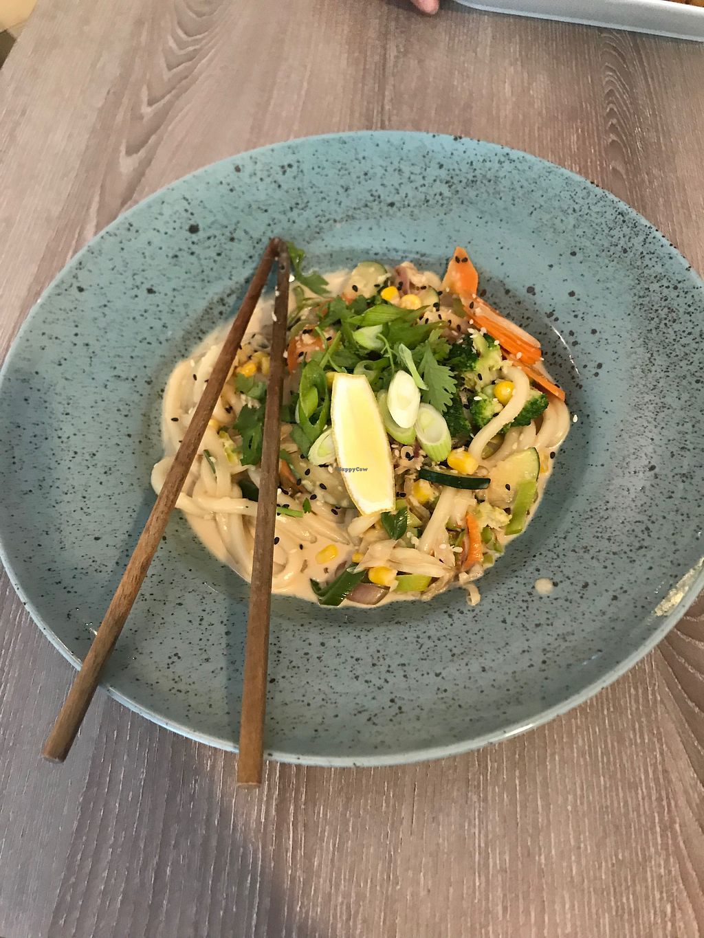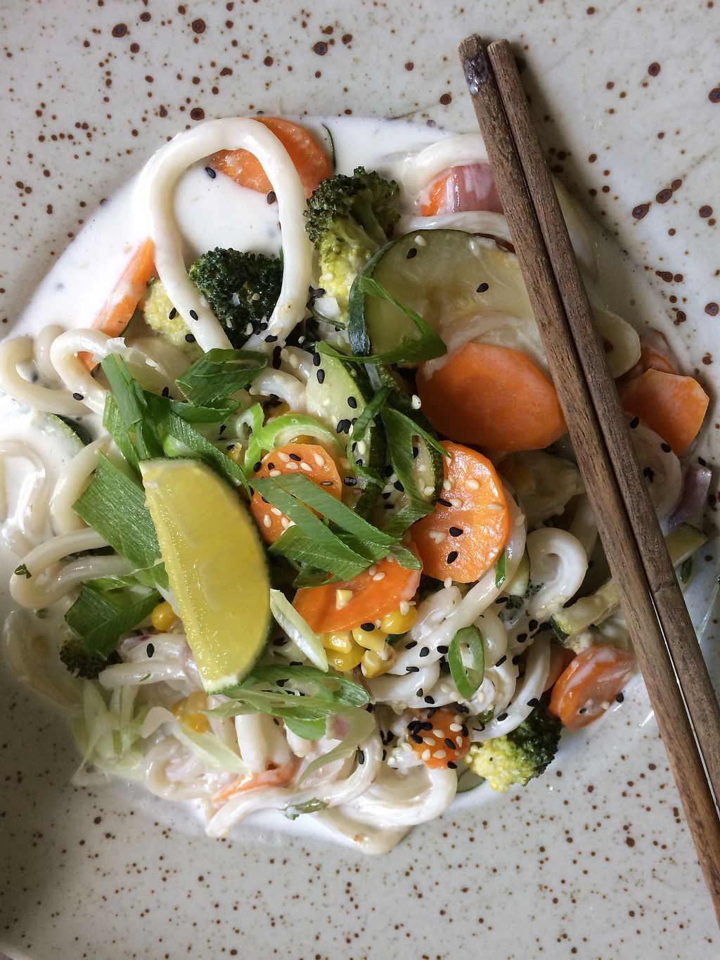 udon noodles with veggies and coconut sauce