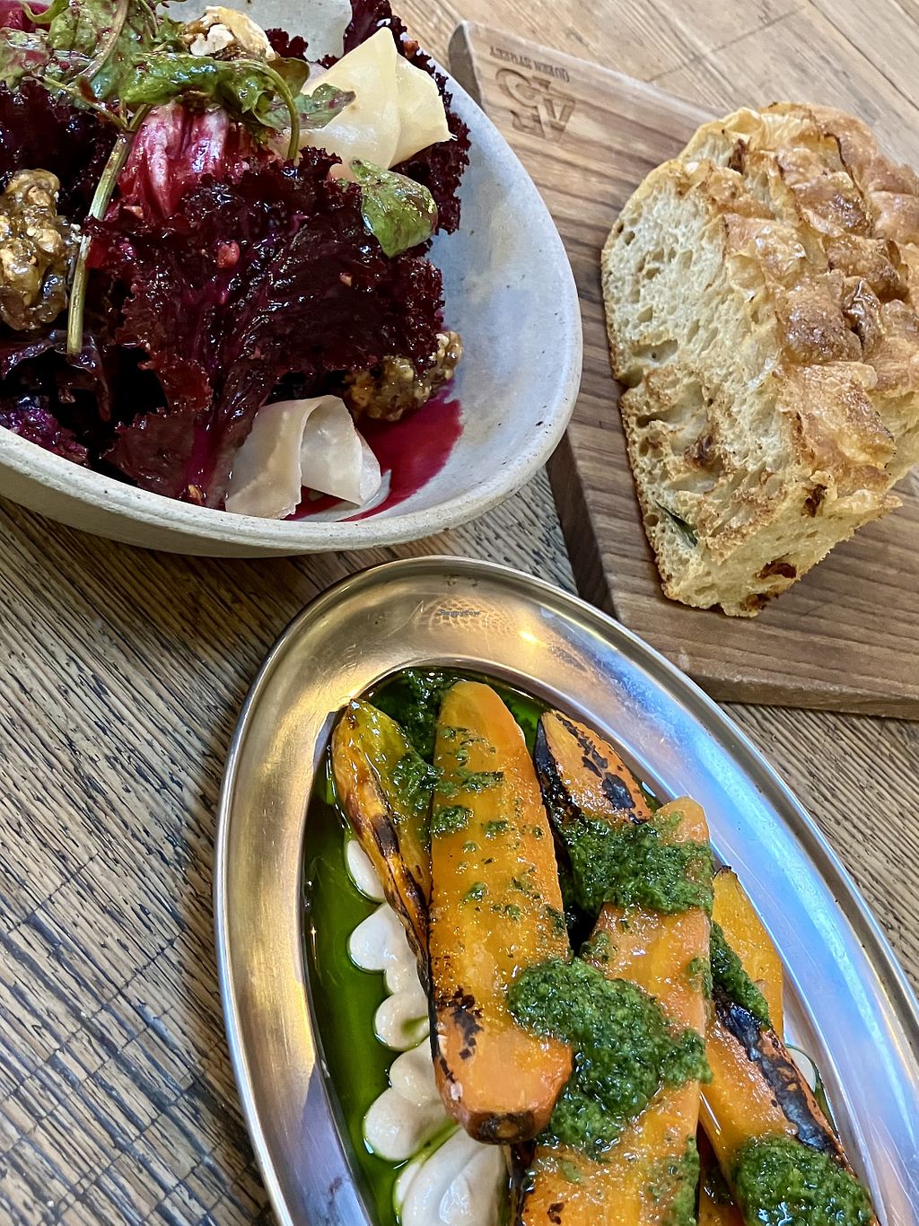 Pretty interiors with a deli of good stuff. Menu is fish, veggie and vegan. I had roasted carrots with tahini and focaccia on the side. It was very tasty. Also has mocktails.