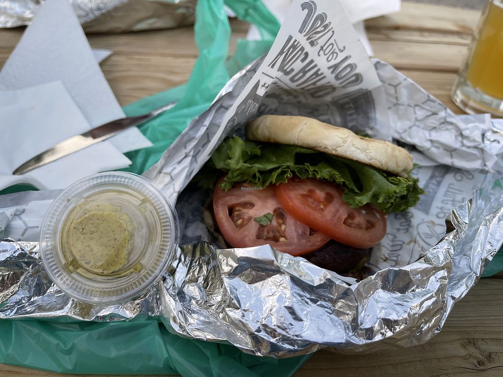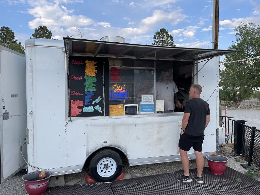 Serves meat, vegan options available. Food truck serving burgers with vegan portobello sandwich. Also offers salad. Reported offering vegan cheese alternative July 2025. Limited choices nearby. Please send additional information and updates to HappyCow. Open Thu-Sun 4:00pm-8:00pm. Closed Mon-Wed.
