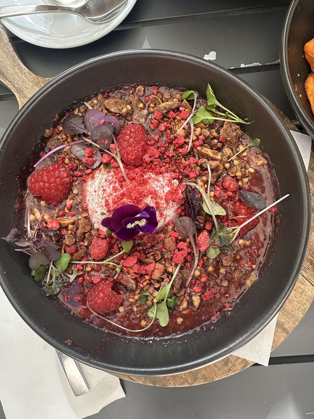 We found this cafe on happy cow looking for a breakfast option that had both good vegan options for my partner and my desired non veg breakfast items, and we were happy to make the trip based on reviews. The cafe was pleasant enough with nice natural light and plants, and a fun puzzle to do on the wall while you wait for coffee and staff pleasant too. My partner had a baked crumble and I had a Vegan drink of a golden latte with my breakfast. The baked crumble was packed with flavour and the golden latte was very nice. Menu had good variety of options for vegans.