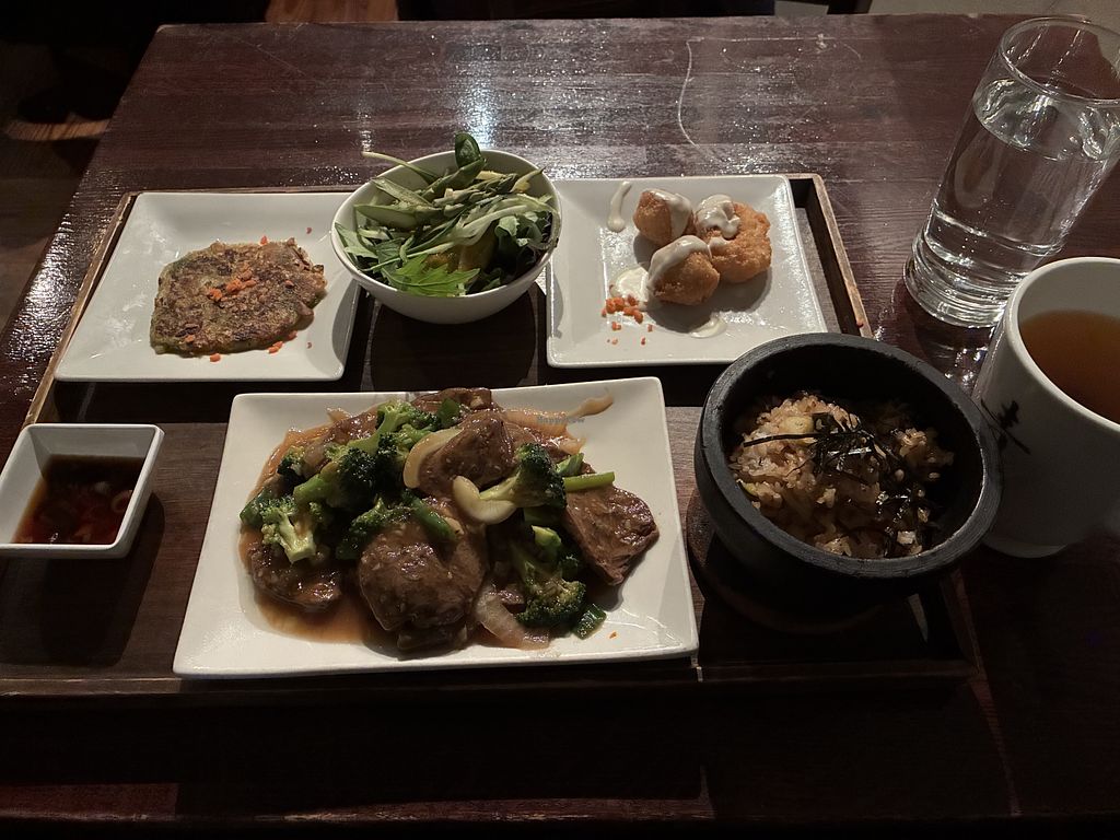 - Crispy Korean Chili Tofu Lunch Special, which included a soup and salad of the day as well as two additional banchan (including a pancake!) The tofu was fried to sweet perfection and the chili sauce was top notch. There ended up being more than enough food just from this alone.