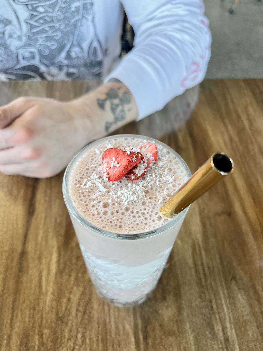 I had the vegan hotcakes. They also had an avocado miso toast, 4 vegan protein smoothies, coffee bar with plant milks, plus a grab & go display with stuff like chia cups & a couple vegan desserts.