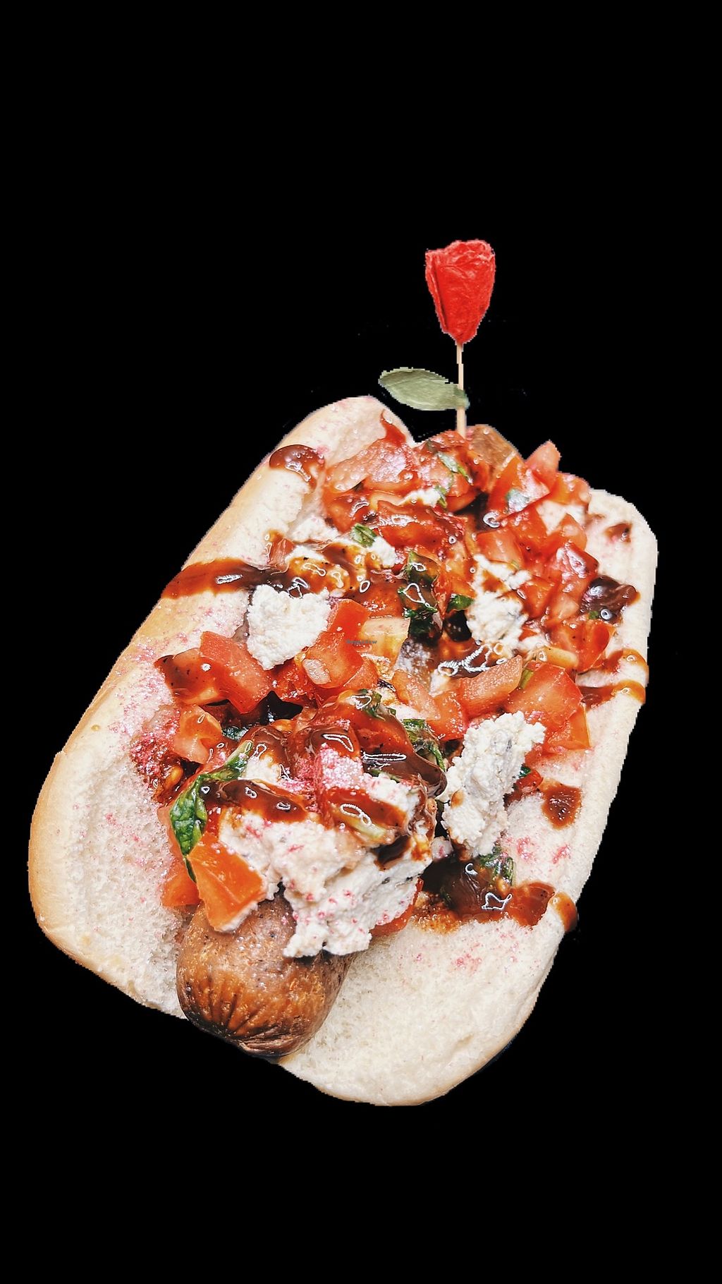 The Jekyll & Hyde (smoked apple sausage) w/ condiments. Delicious✨