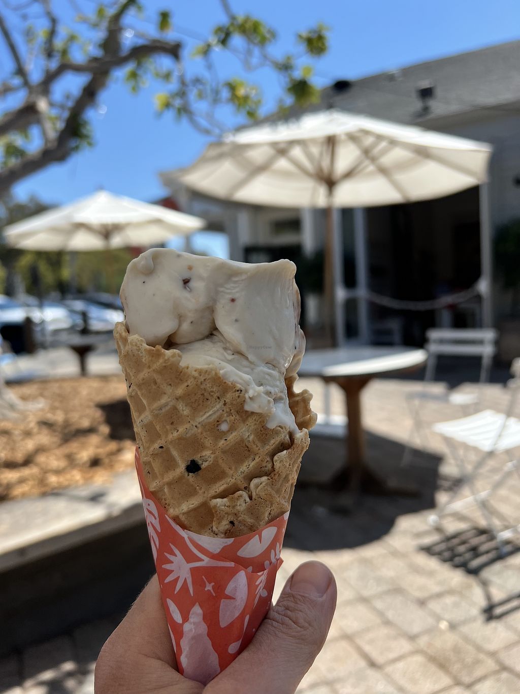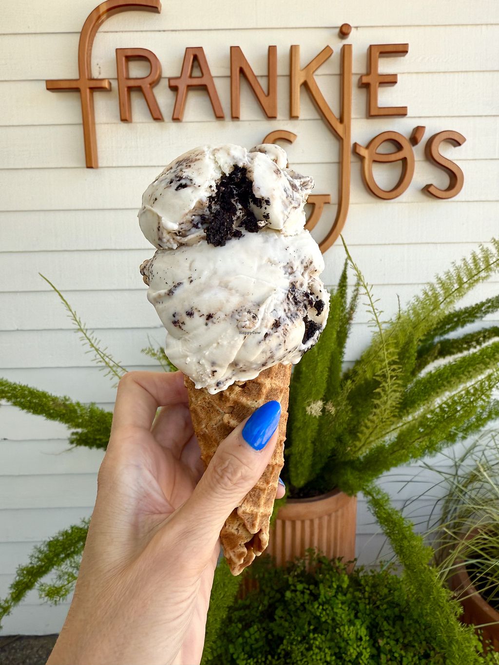 Waffle cone with 1 scoop of Mint Brownie and 1 scoop of California Cab…