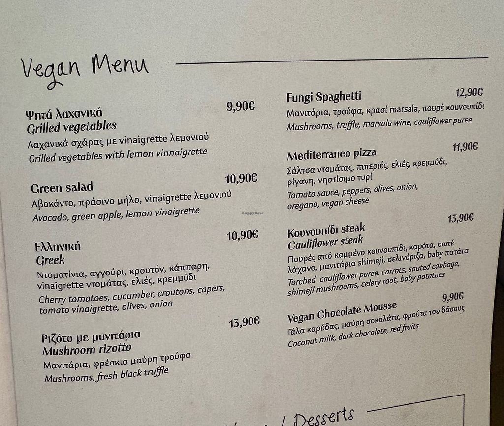 I had vegan bread as first course and then the vegan cauliflower steak which was ultra delicious and as dessert i had the vegan chocolate mousse. I would definitely recommend it to everyone to eat here!