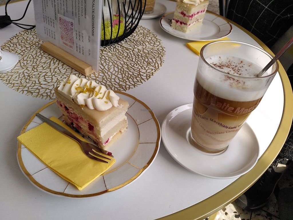 Gâteau aux baies et macchiato, tous deux vegans.