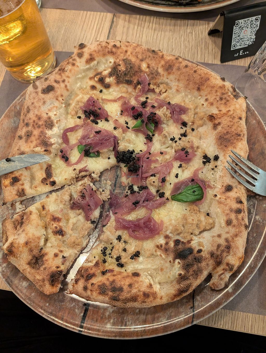 No tuna, vegan mozzarella, caramelized onions, black olives and basil …