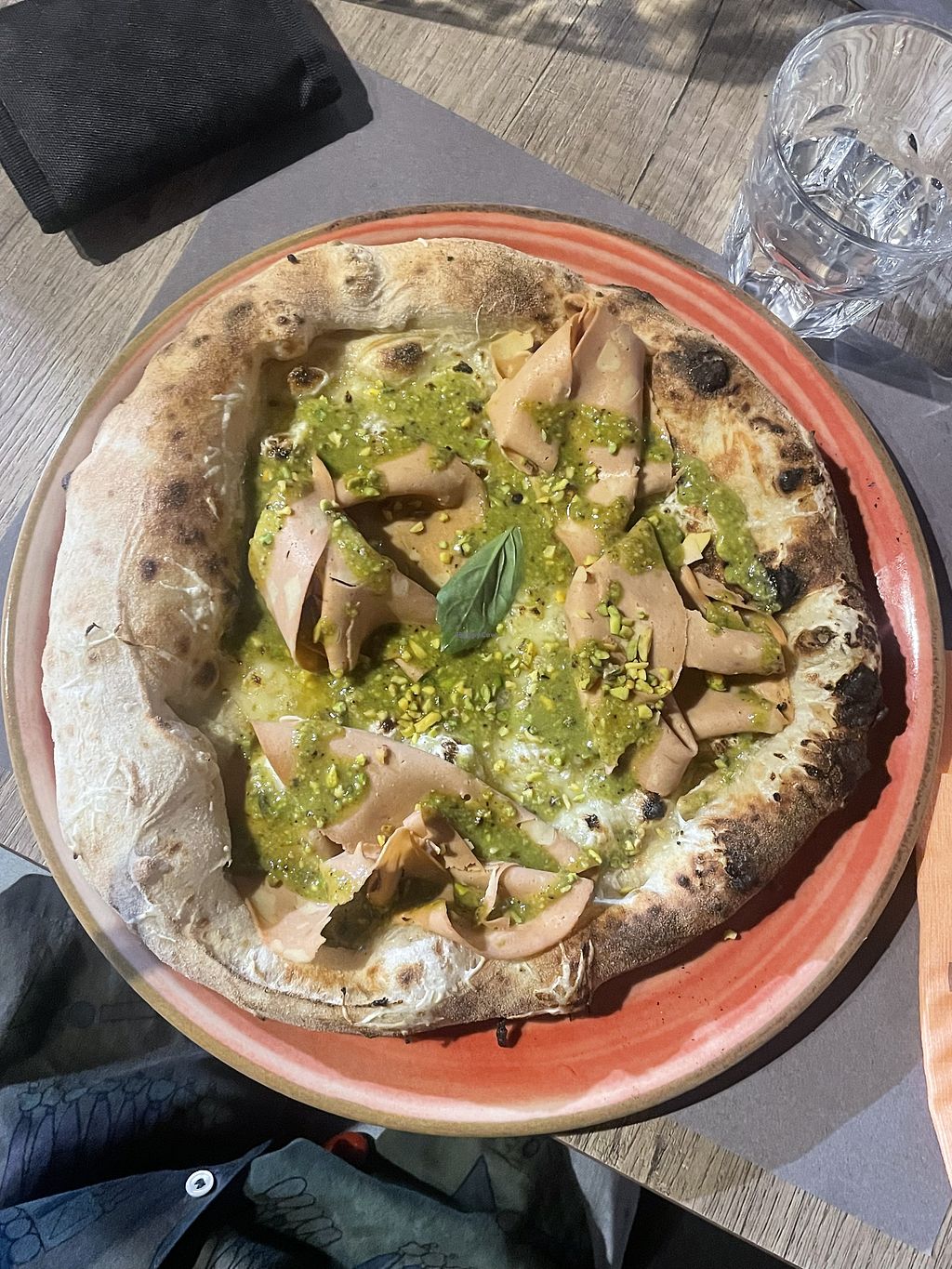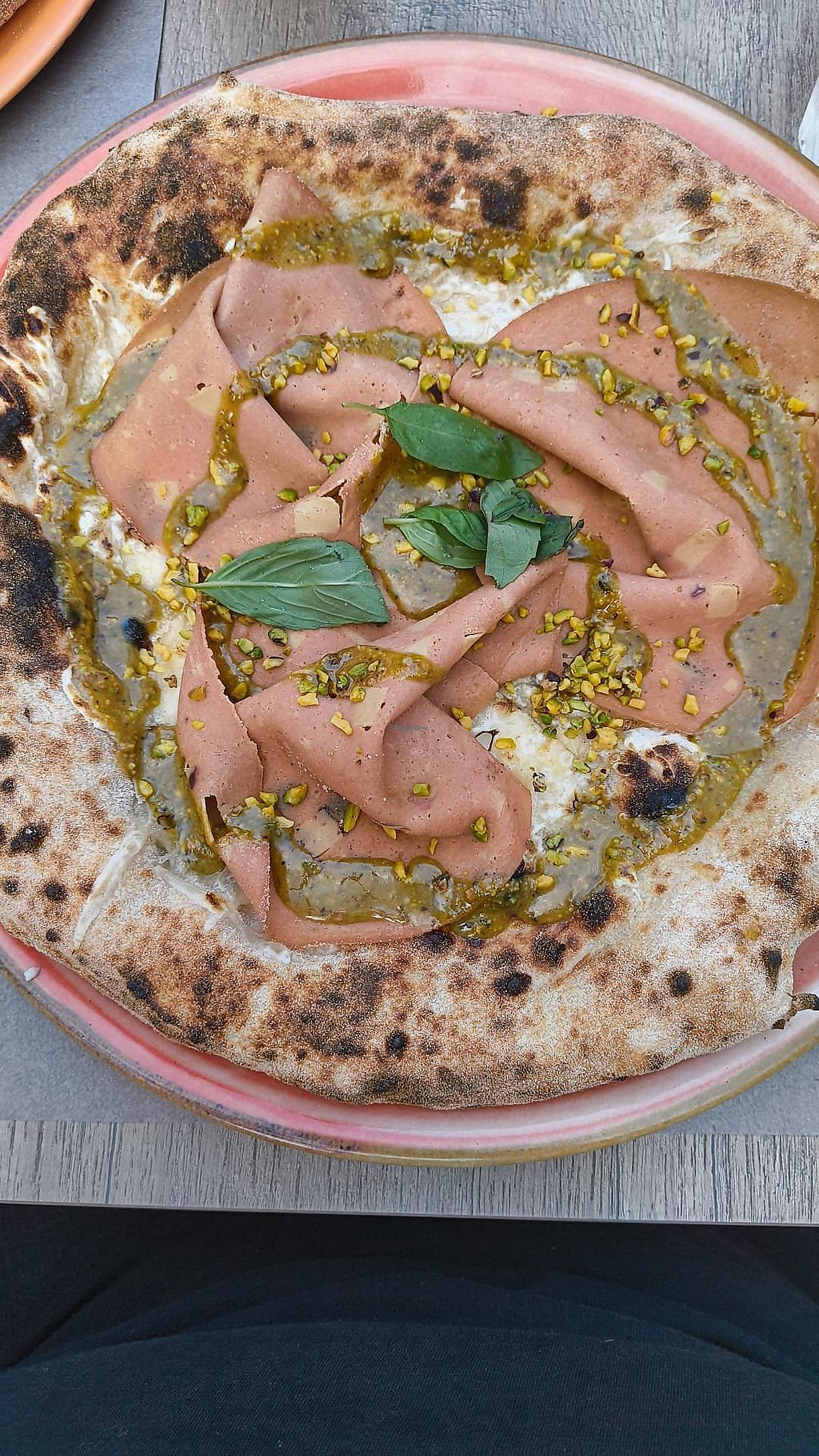 Pizza with pumpkin cream, vegan mozzarella and ham and kale chips