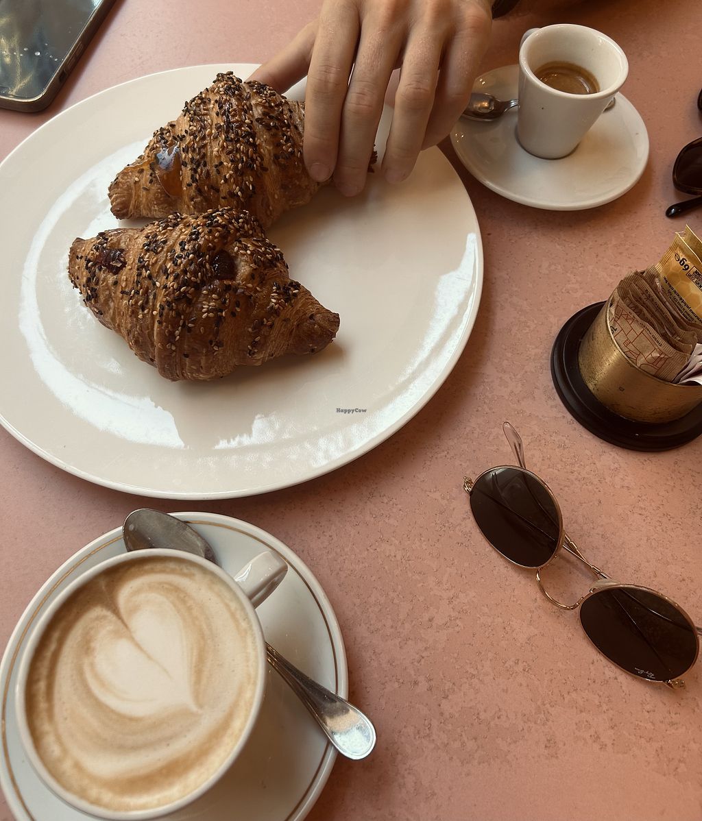 Serves meat, vegan options available. Cafe offering vegan croissants with a variety of fillings such as jams, gianduia, pistachio cream and custard. Also offers vegan focaccia, as well as oat, almond and soy milk for coffee. Open Mon-Sat 12:00-14:30, Mon-Thu 17:30-21:00, Fri-Sat 17:30-21:30, Sun 17:30-21:00.