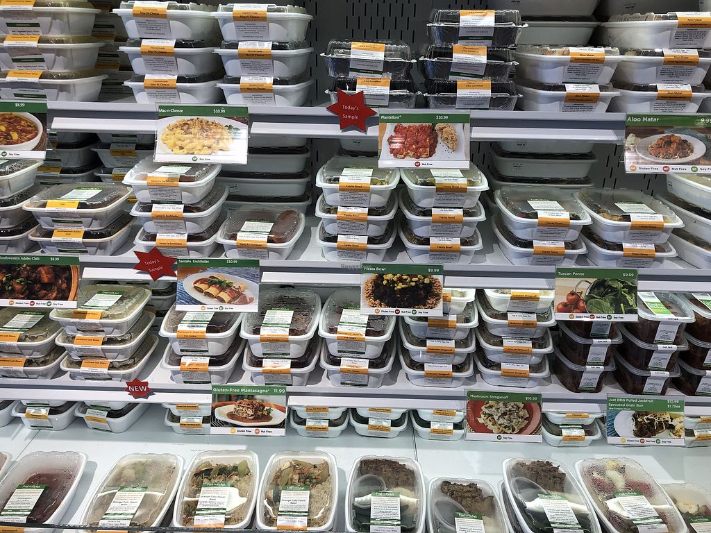 Grab n go vegan food. All meal types (breakfast, lunch, dinner, snack, dessert) and sizes (snack size to family meals). You can eat there or take it home. Calories and nutrition is clearly listed on packaging. They have a reward program and often run specials. Lots of free samples!