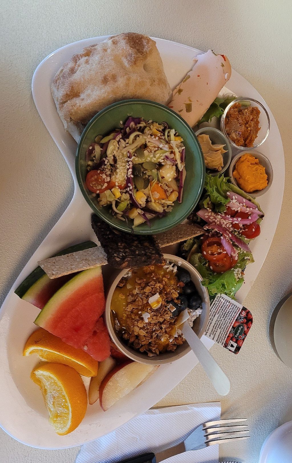 Great selection: date truffles, chocolate cake, crumble, overnight oats, salad bowl, rye bread with avocado, and now also delicious vegan brunch.