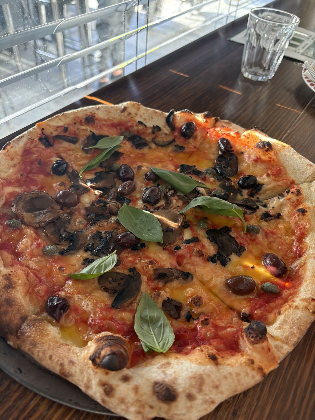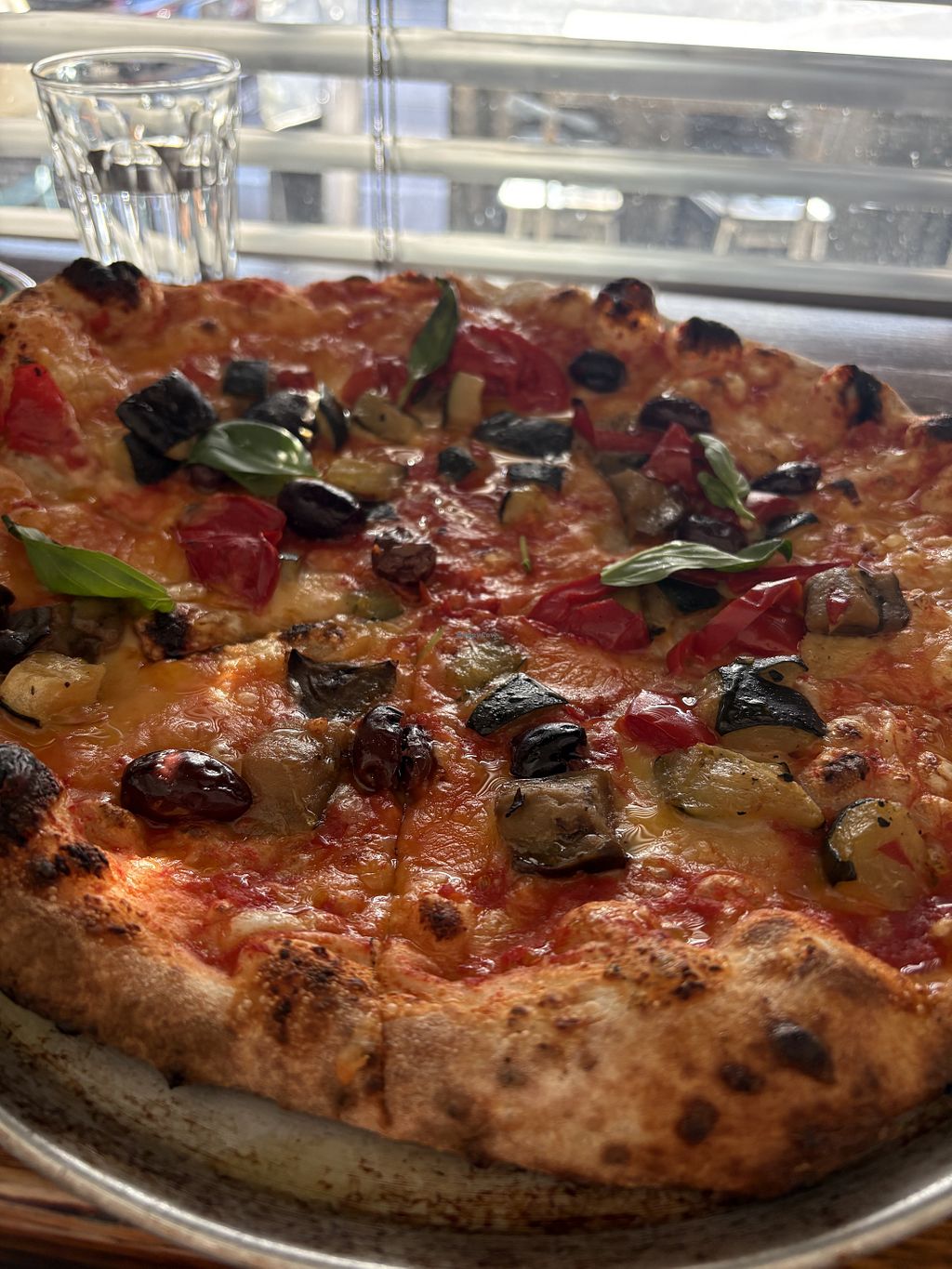 Serves meat, vegan options available. Pizzeria offering vegan options (on request) like Margherita pizza (tomato, basil base), rigatoni alla norma (eggplant tomato pasta), salads (mixed leaves and vegetables), and focaccia (olive oil flatbread). Open Mon-Thu 5:00pm-9:30pm, Fri 5:00pm-10:00pm, Sat 12:00pm-10:00pm, Sun 12:00pm-9:30pm.