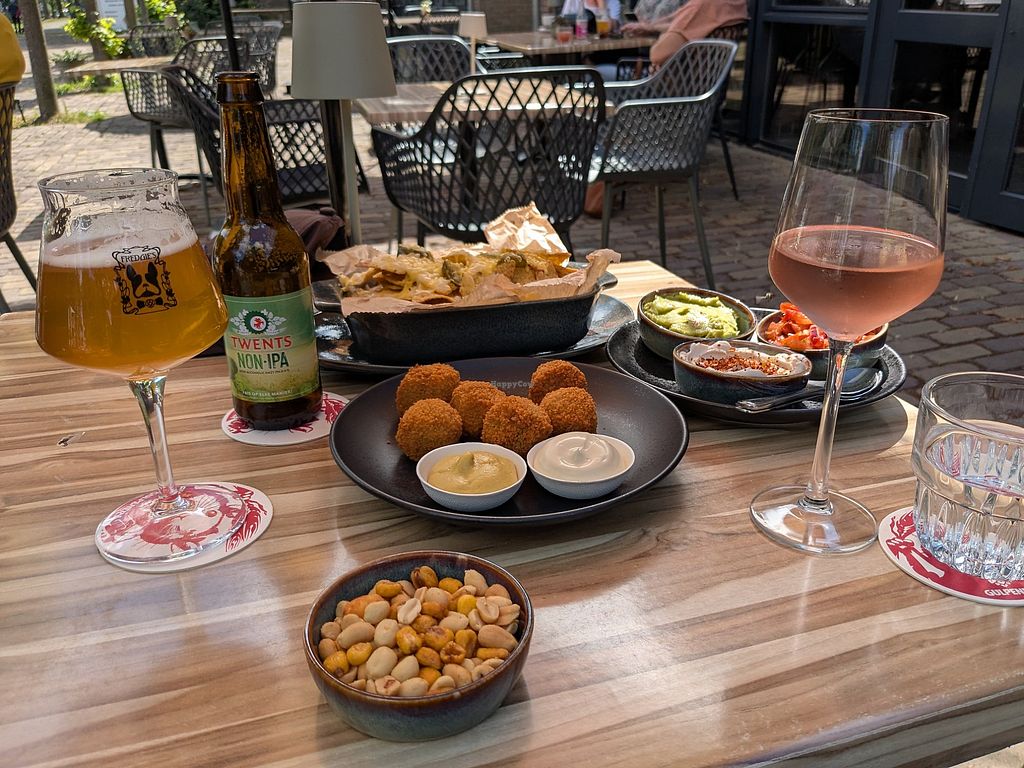 Soort pub (kroeg meets lounge bar) met hele fijne sfeer en super lekkere hapjes. Heb de vegan nachos gehad en de portie was lekker groot met veel dips. Ze zijn niet zuinig en dat is altijd fijn.