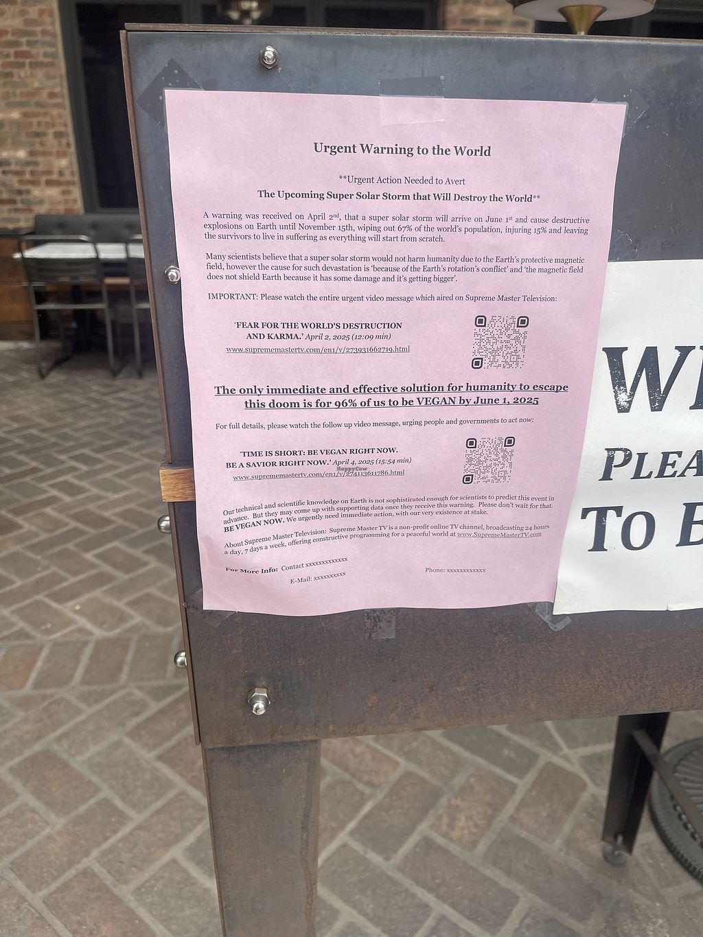 I greatly enjoyed the panini , but after seeing a fake news sign that the owners posted on the hostess station I immediately ordered to go. In such tumultuous times to intentionally share fear mongering apocalyptic stories without creditable sources listed feels beyond cringe. I can’t feel good about patronizing this restaurant again. As a vegan it takes a lot to not support a vegan business.