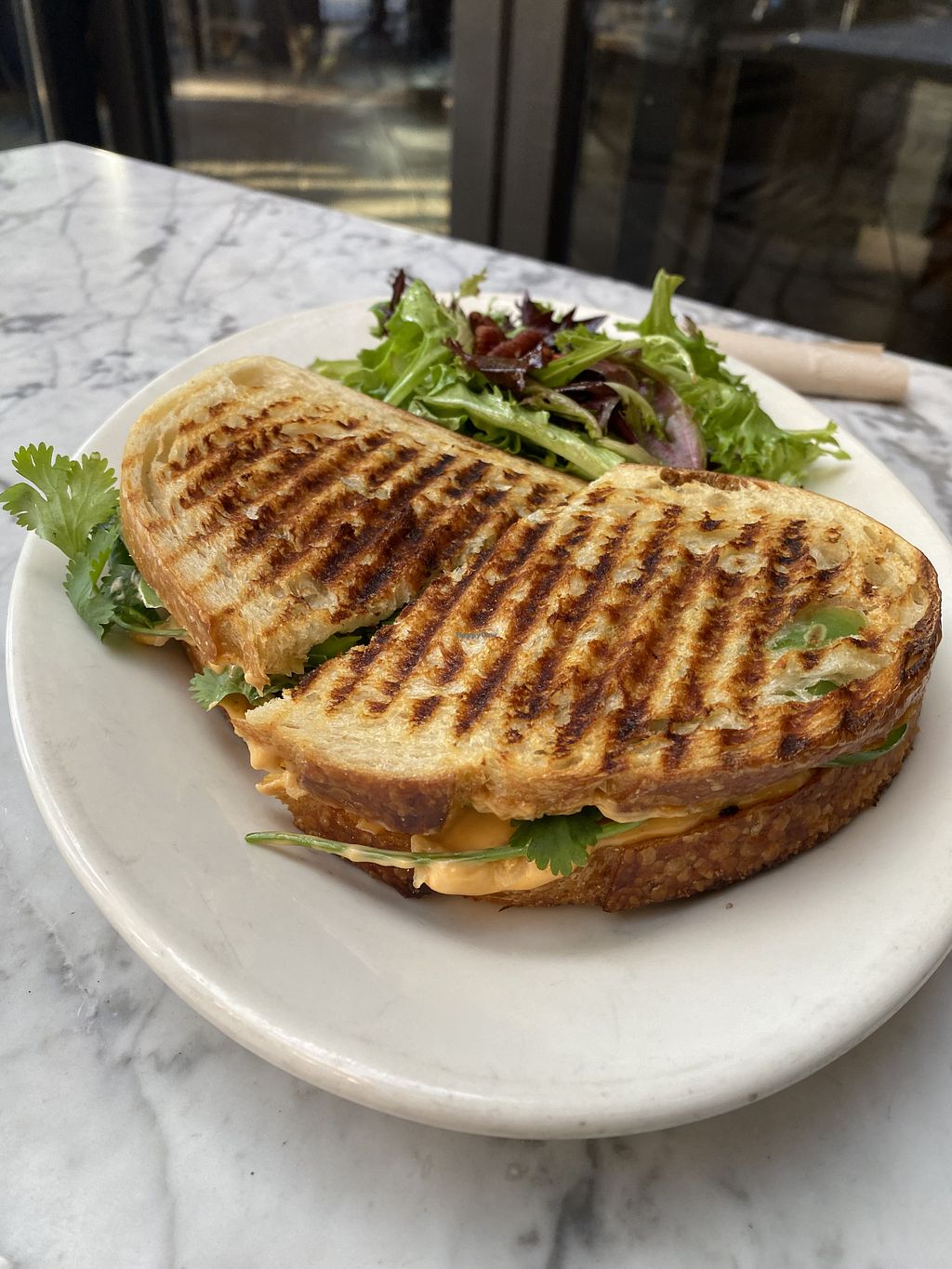 I’ve been dining here since their soft opening (and miss the cake display!) I used to come on breaks with a college friend between classes and now only come to treat myself. My go to beverage is the matcha granita as it’s the only thing I can decide on. Between sandwiches, ramen, and breakfast options I really struggle to make choices. Some of my favorites are the Hatch burger, the Continental Breakfast, and the Panini Frittata. I also have a tendency to order key lime cheesecake despite being stuffed. The atmosphere is cool and sophisticated but relaxed and casual. On this particular visit I ordered the Smoked Ham sandwich with a side order of the Soup du Jour, butternut squash. Never a let down for flavor! My previous visit did surprise me as I wanted to have a drink and cake before my hair appointment across the street but they deemed it take out only unless you order an entree, I’m not sure how long that has been in practice or if it will continue but something to be aware of.