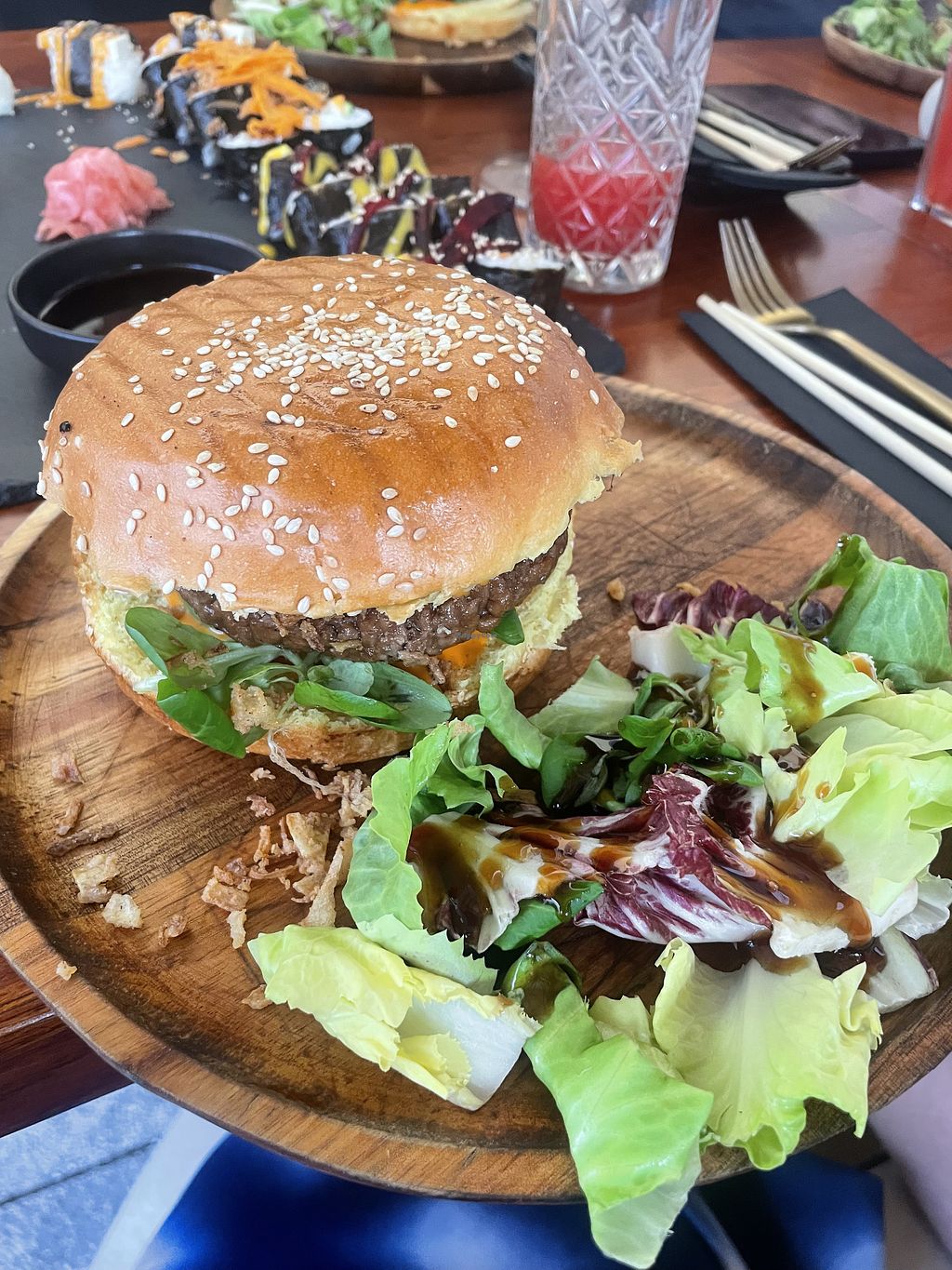 food & juices were delicious and the sushi was presented beautifully. the vegan burgers were great & had a very meaty patty (something like Beyond Burger).