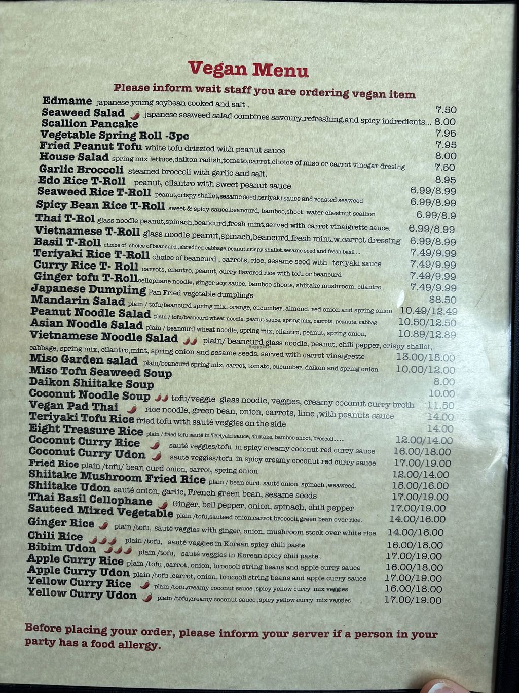 PS Another reviewer noted the pad thai, so I thought it was worth a further mention. There was a "scandal" with their pad thai **many years back. I think what happened is that they advertised it as vegan but they did not know that some base ingredient they used contained fish sauce. It was a legitimate and honest mistake -- they DO know what vegan is and they were super embarassed by it from what I could tell, were apologetic, and now they just say "sorry, our pad thai is not vegan" (too bad, it was really good, haha!). Keep in mind they are a budding new place in the past decade-plus-or-so, and from what I know of the owners that pad thai mistake was a learning point for them. I have absolutely NO qualms about trusting them with vegan now, they learned and did so humbly as well.