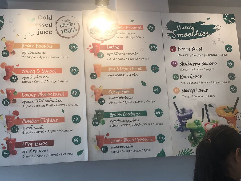 Offers cold-pressed juices with no added sugar, ice or additives as well as smoothies. Located inside Rimping Supermarket near Nawarat Bridge. May also sell desserts with dairy. Reported closed December 2022.