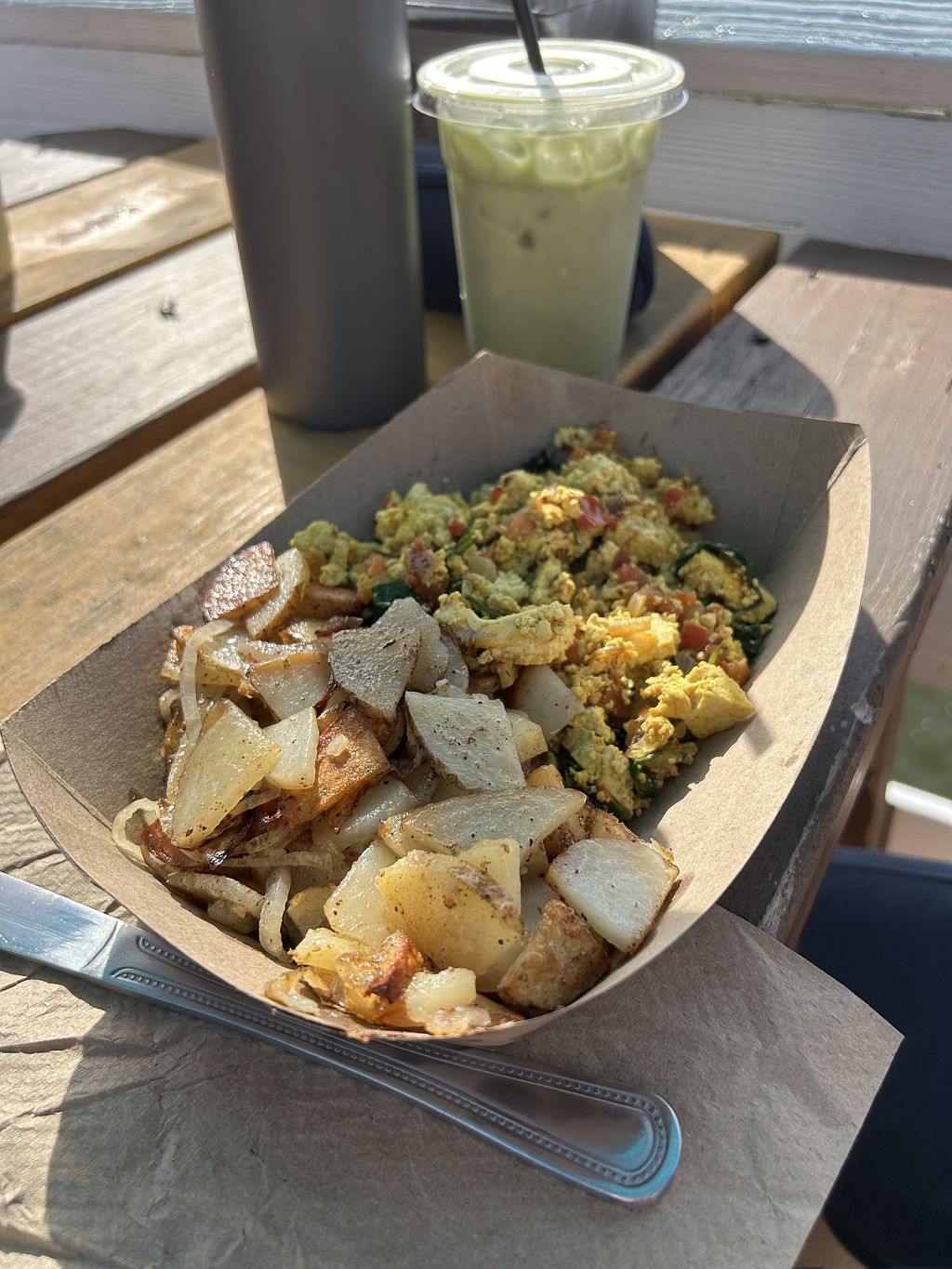 Tofu scramble with vegan cheese, mushroom, spinach, onions and peppers…