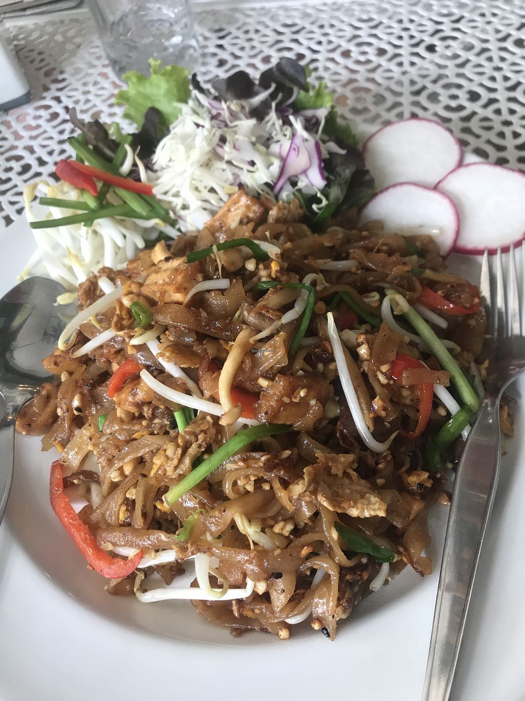 I regret that it has taken me so long to discover this fantastic veg cafe! It’s in a great central location with cute indoor or outdoor seating and nice big floor fans that actually keep you cool. The owner and chef is the sweetest person on the face of the earth and gives great service, including customizing orders however you like (everything can easily be made vegan except for the omelette). On my first visit I had a perfectly made pad ke mao with noodles. It was super fresh with loads of veggies and delicious mushrooms. And a heaping fruit platter for dessert! I found the quality and authenticity of everything I’ve had here to be the best in the area. And that the owner makes you feel so warmly welcomed and never rushed makes this a new favorite of mine.