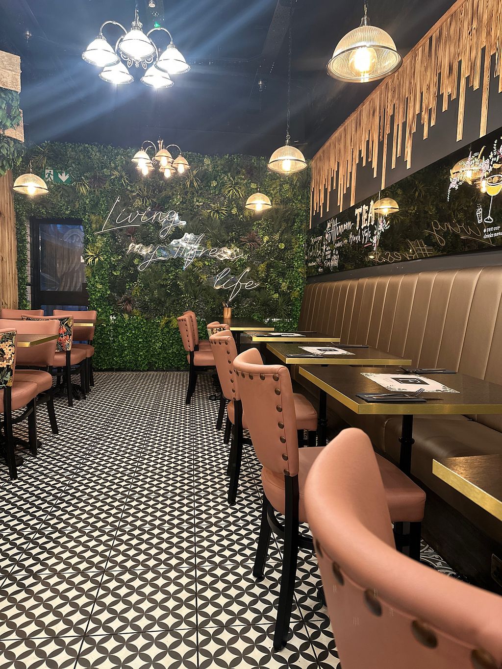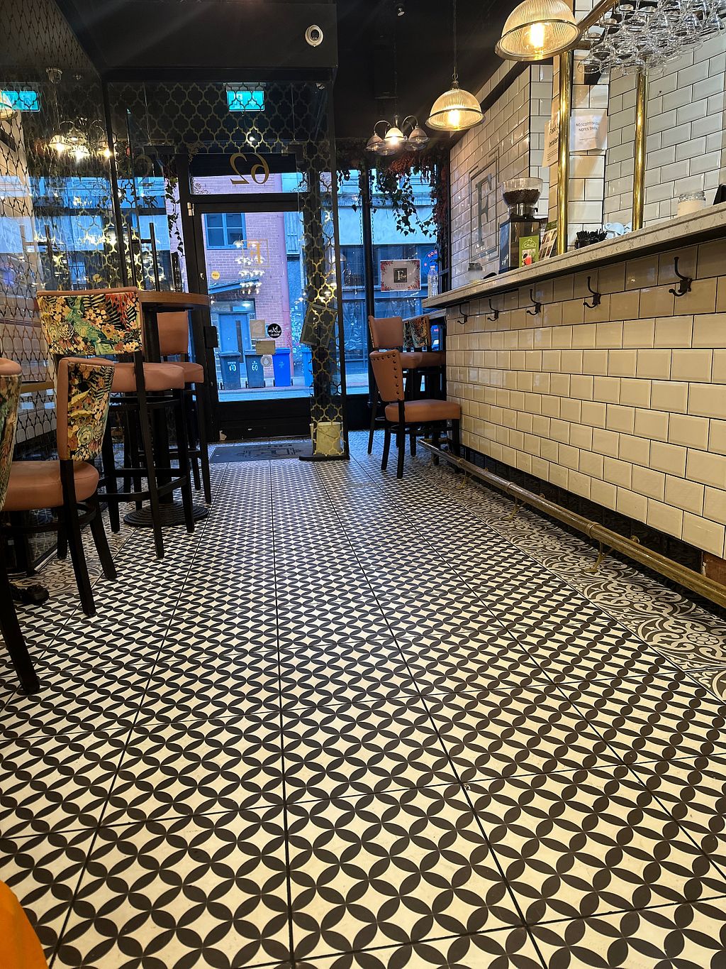 Friendly service, and fast- we loved the care put into the food and it was a really nice atmosphere, will definitely go back. The tables and chairs are very clean and well designed, the menu is exciting and the general decor is lovely. The Vegan full english included scrambled tofu, tomatoes on the vine, nice vegan sausages, beautiful (sourdough?) bread,