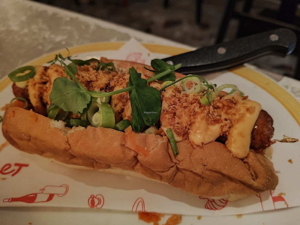 Great place. Really cute cafe, very helpful server who was able to help with the menu. We had hot dog, cauliflower wings, fish & chips. All delicious. The ‘fish’ is banana blossom & comes with a delicious tartare sauce. Because our mains were so good we also ordered desserts & coffees. Lemon & poppyseed cake and a lemon macaron & iced lattes. All wonderful. We loved our meal here & plan to come back to have more of the menu