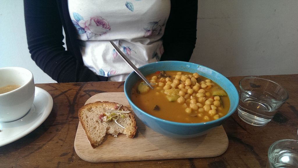 Should be 3.5 stars. I ordered a humus burger (€5) and a chocolate cake (€4?). The burger tasted ok but it was small with the size of a fist (or maybe the price is like this in Europe I wonder?). But the chocolate cake was great! The menu was on a big blackboard on the wall behind the counter. The letters on it could be bigger.