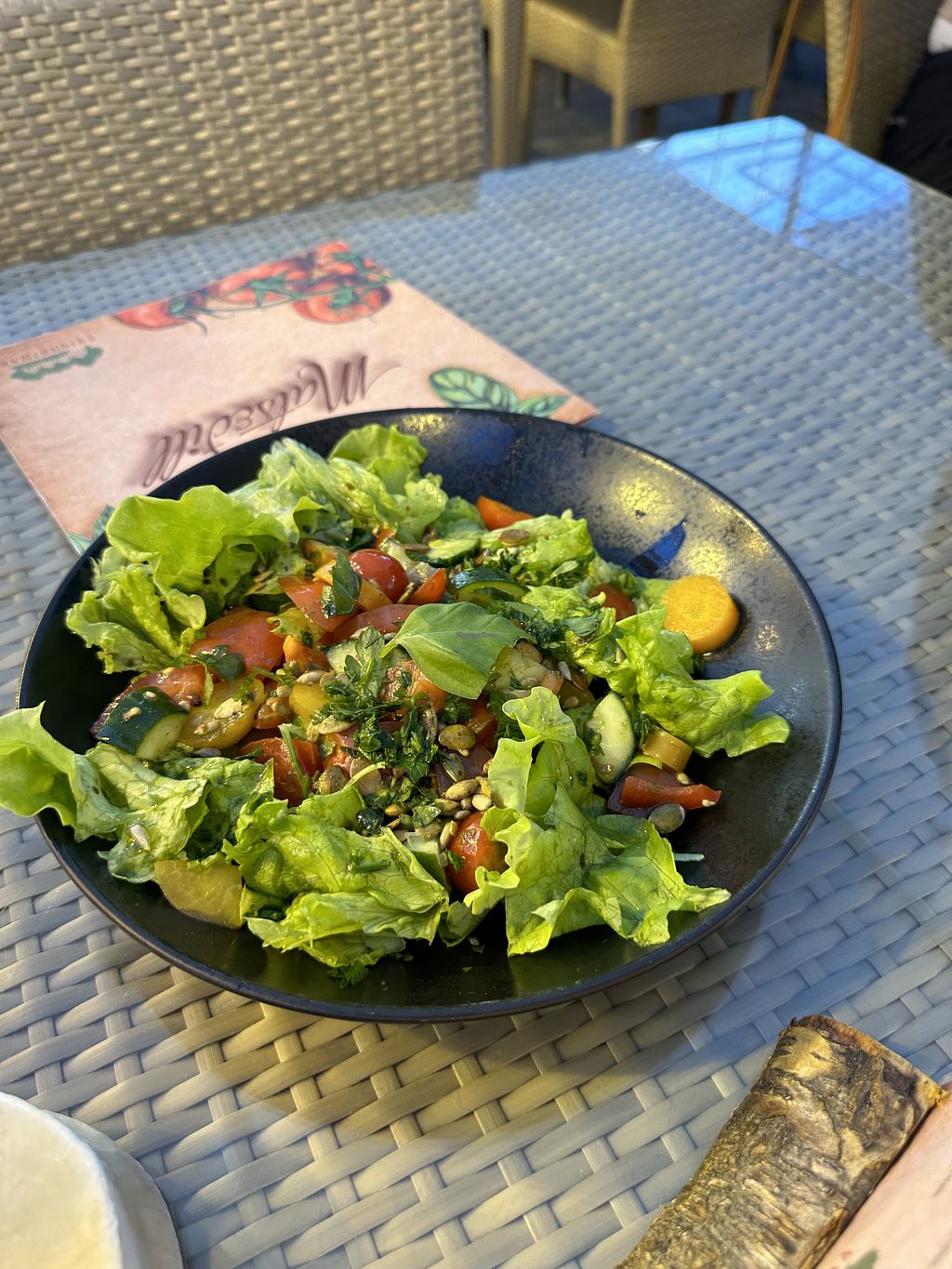 The menu in general is very small, but they did ensure vegans have several options which was nice. Everything was incredibly fresh. The soup was all you can eat. The menu says the bread is vegan, but it looked like some of them have cheese. I didn’t ask for clarification. I just didn’t eat the ones that looked like they had cheese. You can sit outside or within the greenhouse. Everything has tomatoes, so don’t come here if you hate tomatoes 😂