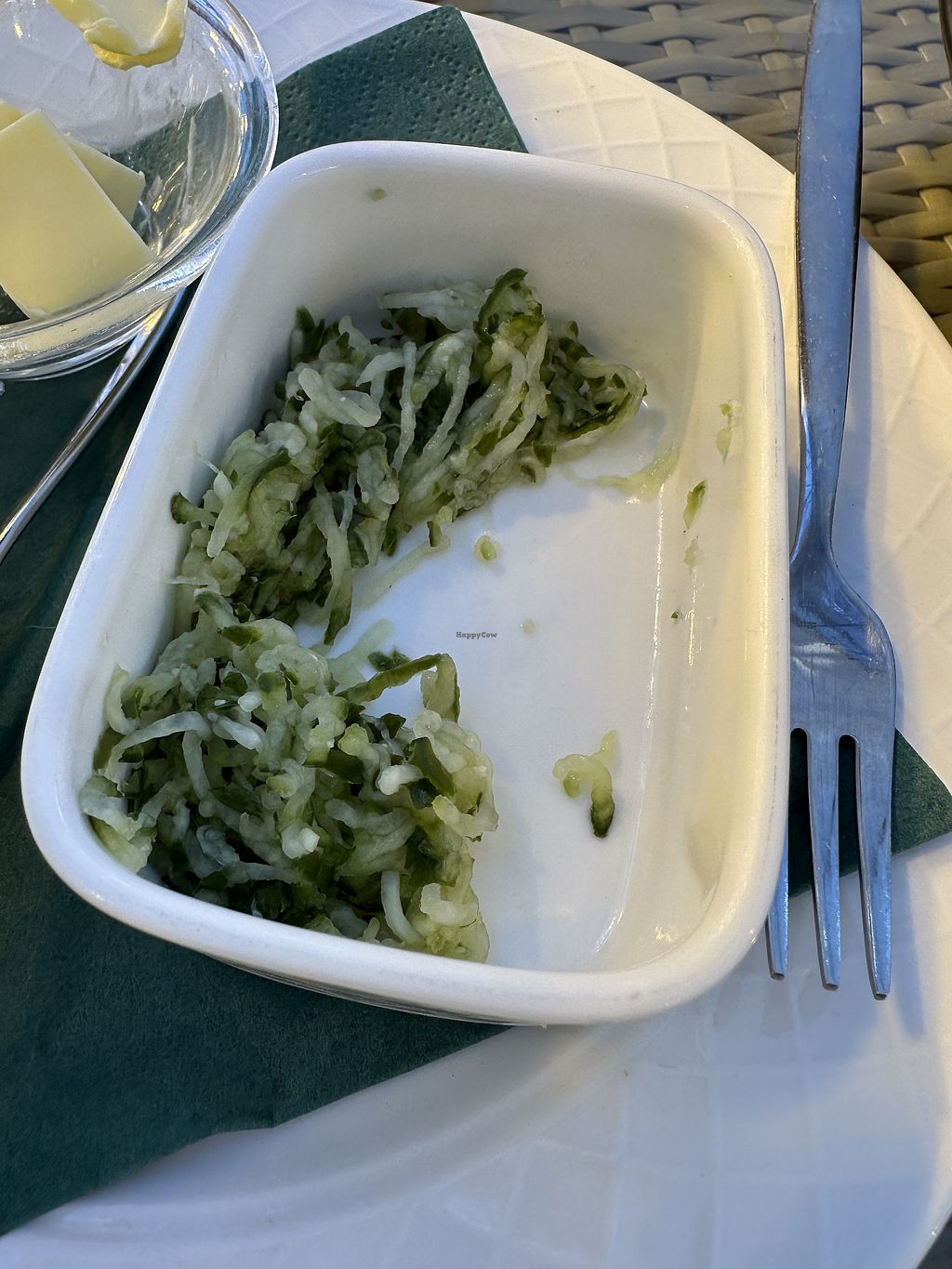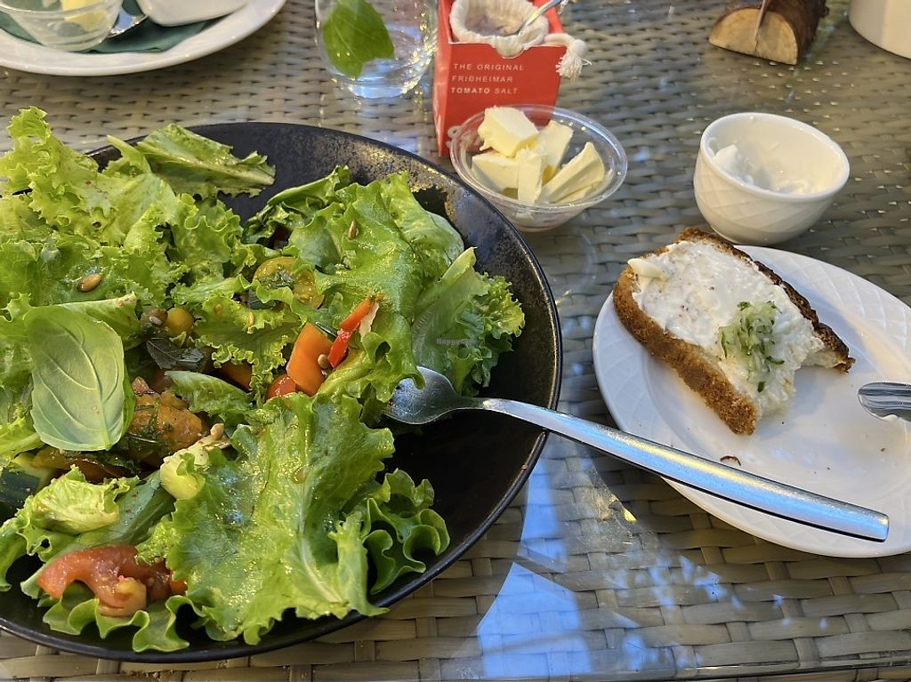This is a tomato greenhouse with a restaurant and bar included. The do offer dairy and seafood dishes. I had their signature dish, tomato soup and the salad and both are designated vegan on the menu and I also double checked with the waiter. The soup comes with bread, and some varieties of bread are topped with cheese. The soup was flavorful and delicious, as was the fresh crispy green salad. Basil plants are on each table with scissors, to cut fresh for your meal.
