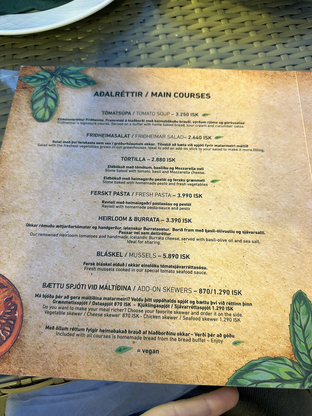 Vegan options clearly marked on the menu. A beautiful environment with fun tomato options. A must visit if you are in Iceland!