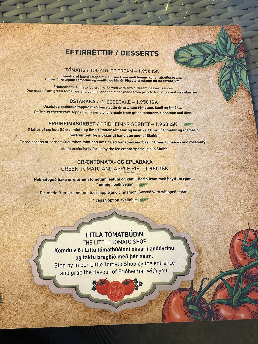 For dessert we ordered the Froðheimar sorbet. Three different varieties of tomato sorbet! We originally ordered this for the experience. Because when will we be back to a tomato farm and get to eat tomato sorbet? It was so surprisingly good! Definitely suggest it.