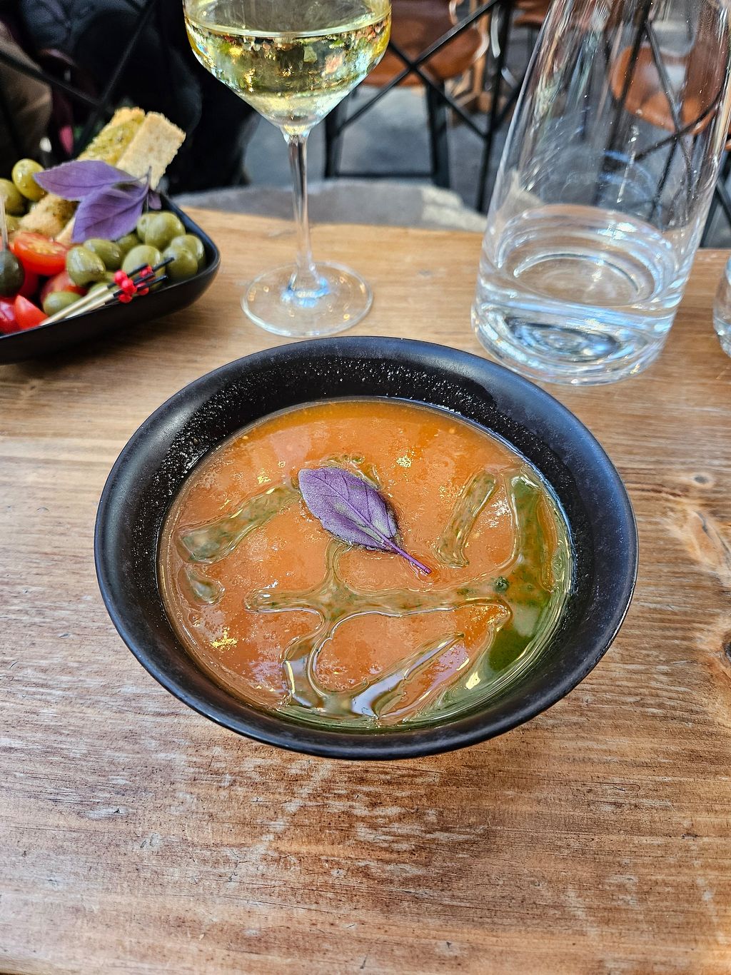 Got bread and tomato soup and a veggie skewer. Very fresh but no protein options. Also quite expensive