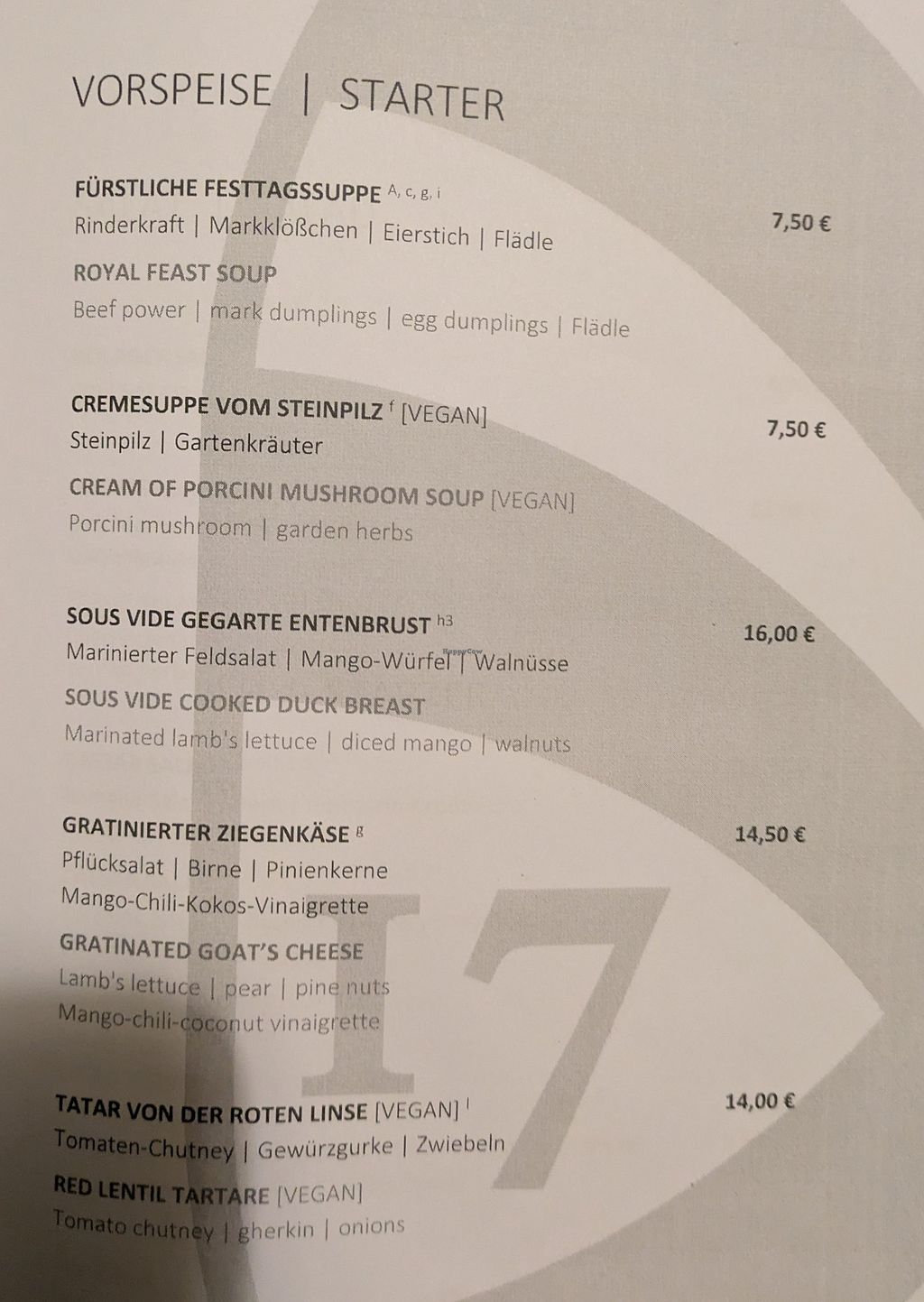Serves meat, vegan options available. Upmarket restaurant and beer garden in a restored Baroque building with views of the castle. The menu changes seasonally, but always has a number of labelled vegan options. Choices could include dishes like polenta with fried artichokes and zucchini, pasta with cherry tomatoes and basil, salads, and baked falafel with artichoke cream. Open Mon 18:00-22:00, Thu 18:00-22:00, Fri 18:00-00:00, Sat-Sun 12:00-22:00. Closed Tue & Wed.