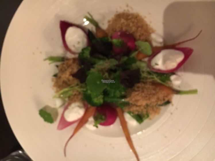 You have to go downstairs from the Store front to get into this restaurant so there is no natural light which is unavoidable, but a very nice ambience. We were taken to the bar to wait for our table where the barmaid made a fantastic cocktail. The menu is very simple, everything is vegan and it contains 3 starters, 3 mains and 3 desserts which change monthly. I ordered the Aubergine Marscapone and my husband ordered the garden salad and both were absolutely fantastic. The best vegan meal out I have ever had, 10/10 for taste and the presentation was beautiful. The waitress who brought our food also took the time to explain the dishes to us when we were served which was a nice touch.
