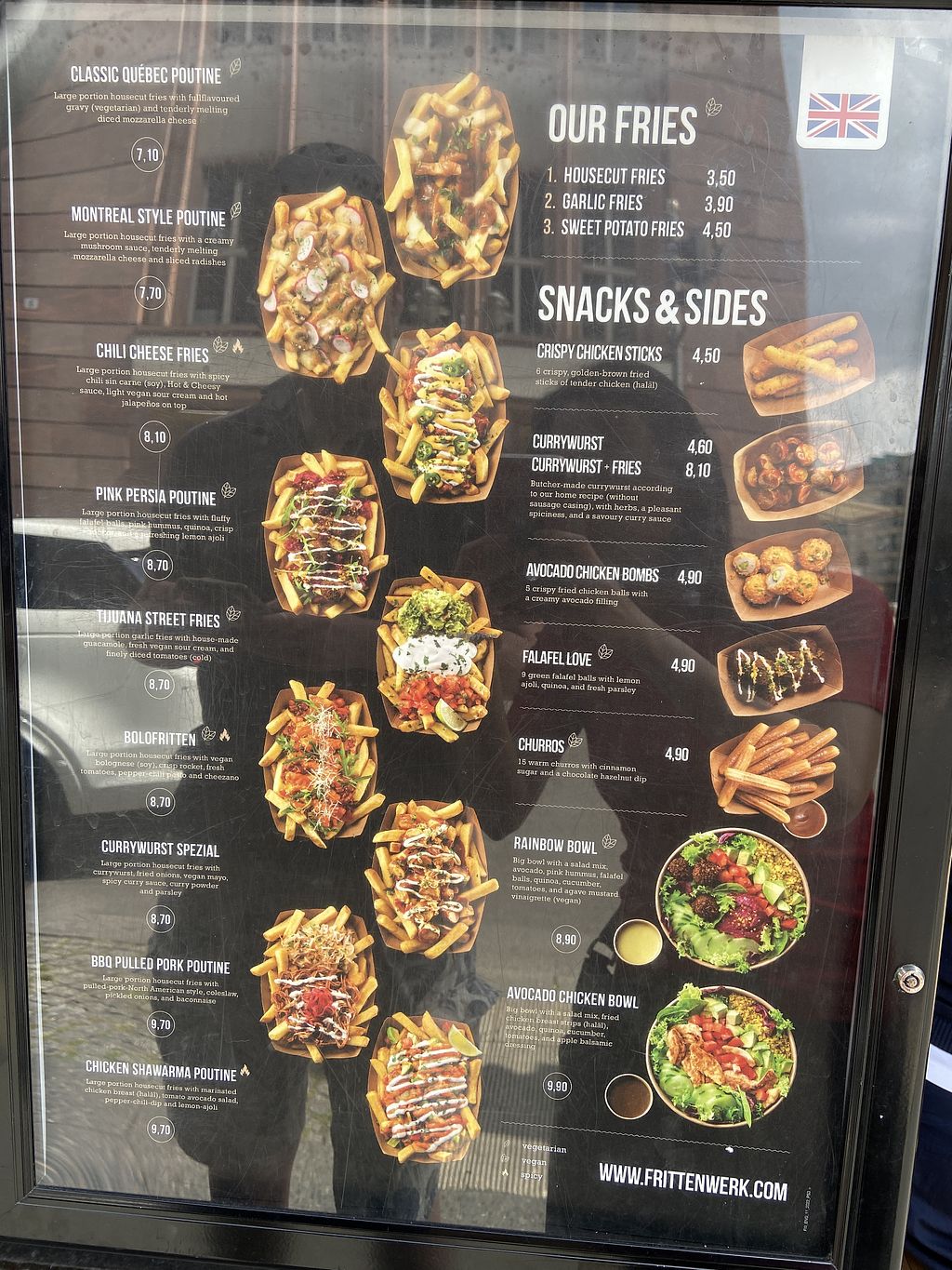Es gibt ein paar vegane Optionen, diese sind auch gekennzeichnet. Schmeckt sehr gut, wenn man soßiges und fettiges mag.