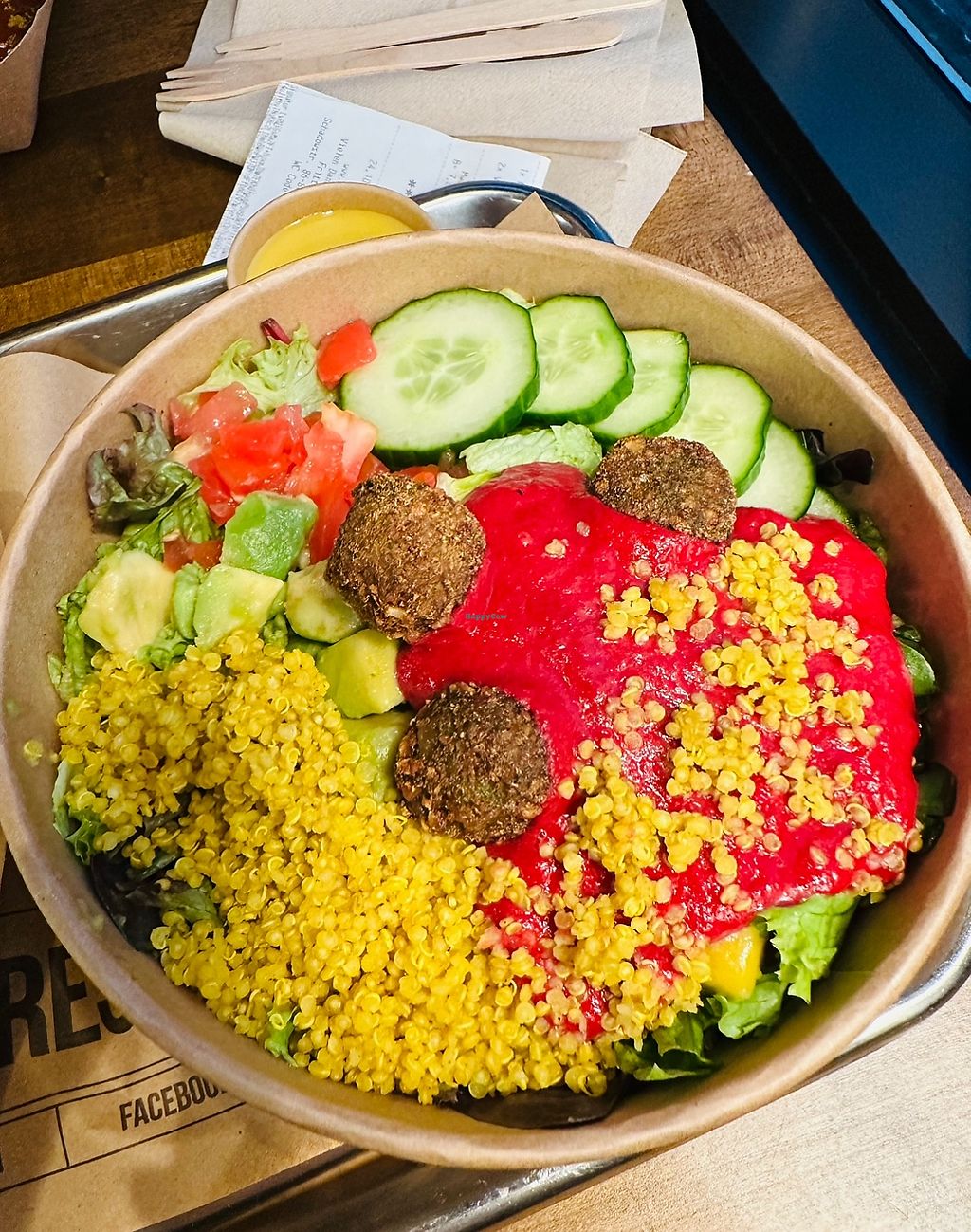 Stopped for a quick lunch and had the rainbow bowl x3. Decent tasting and healthy but with three small falafels it was a bit lacking in value.