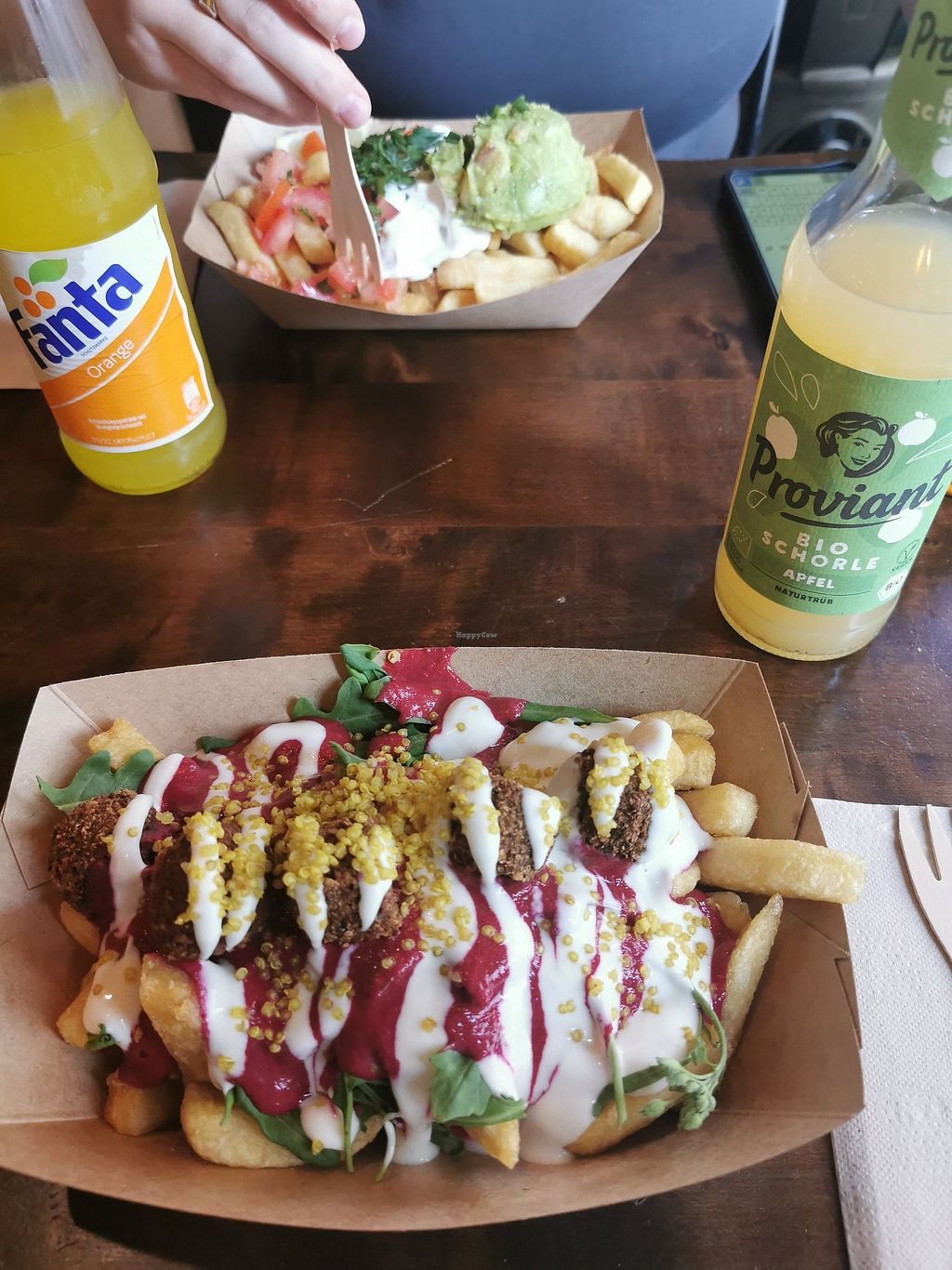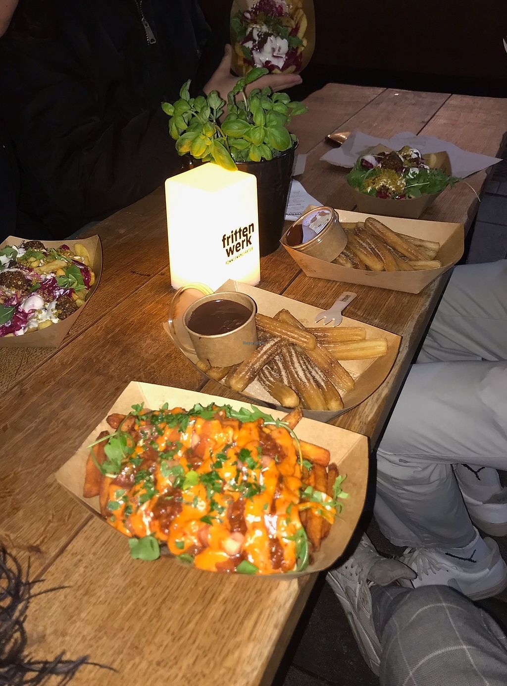 I love Frittenwerk and it's fries so much. I was so happy when I saw that there is one in cologne, because the "pink persia poutine"-fries with pink hummus and falafel balls is the best and I could eat it every day. The other vegan options are fries with vegan Bolognese and as a dessert vegan churros, but without chocolate sauce because it's not vegan!