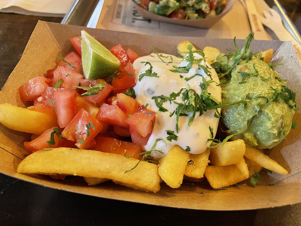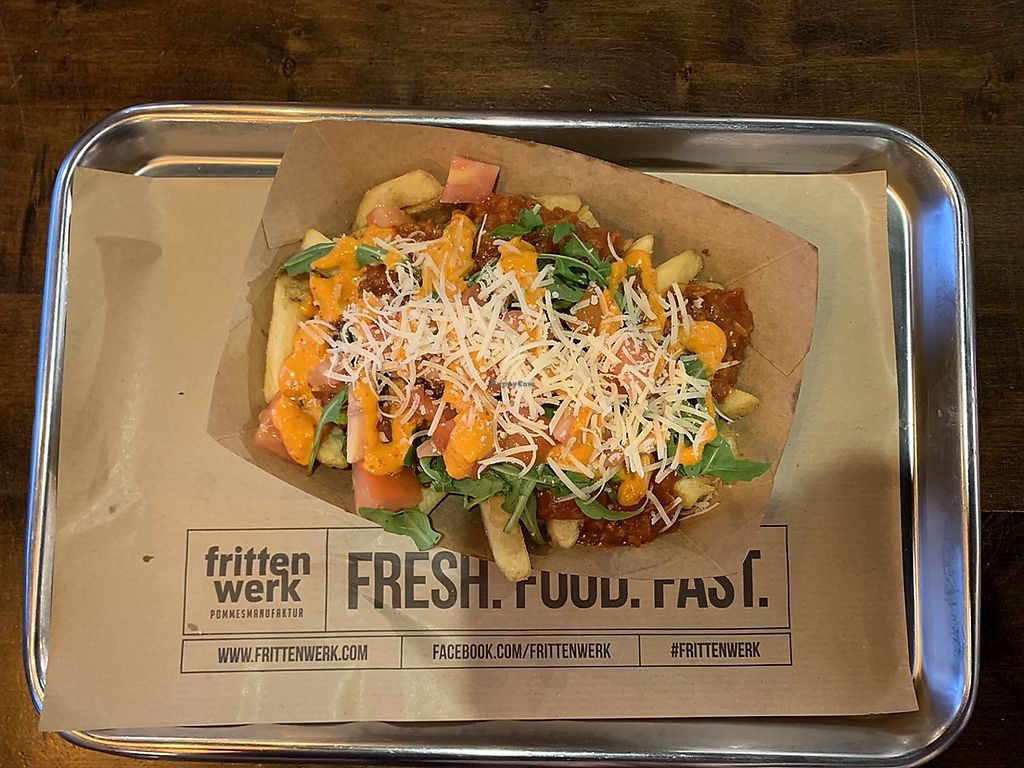 Es gibt zwei vegane Gerichte - die Bolo Fritten sind super lecker und absolut zu empfehlen! Oben auf die Bolo-Soße kommen frische gewürfelte Tomaten, Rucola und veganer Käse, was allem eine frische Note gibt. Der Preis scheint zuerst etwas teuer, aber es ist eine sehr große Portion, die dem Preis gerecht wird! :)