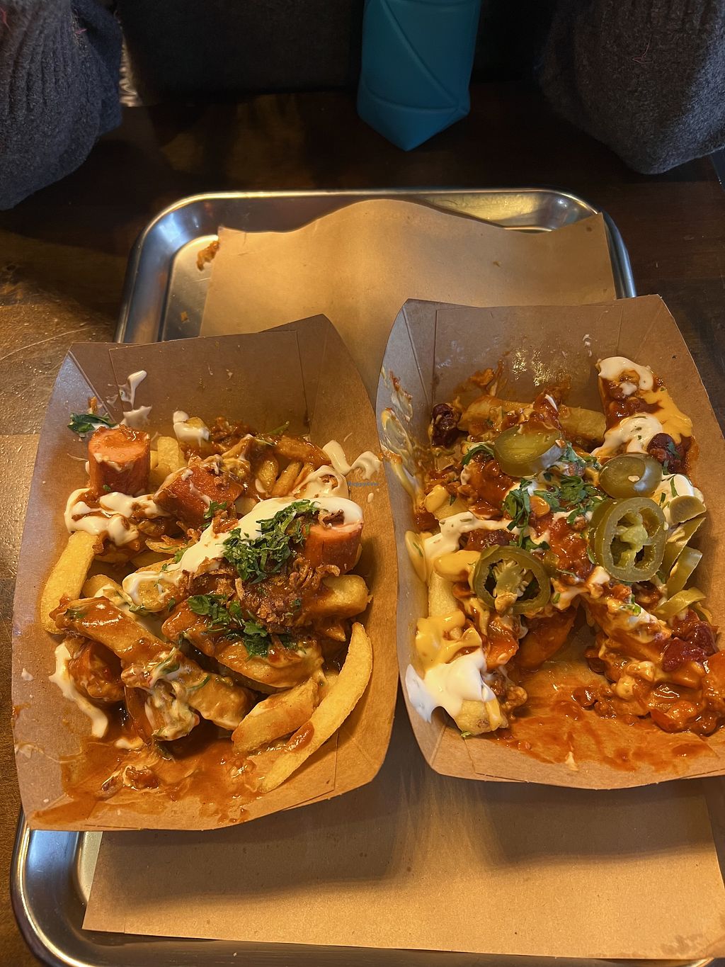 I got the vegan currywurst fries €8.70 and the vegan chili cheese fries €8.20. I got them both with garlic oil for €0.60 more per order, but I couldn’t tell at all, so I don’t think that’s worth it. Tbh, just because of the price, I personally wouldn’t go back. But I think it tasted amazing to try once and for the novelty of not ever getting to eat this.