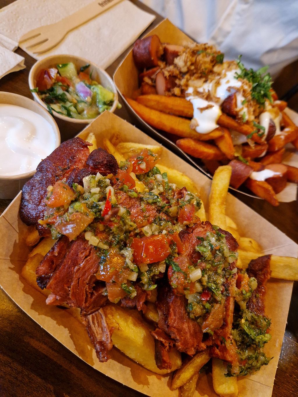 Es gibt einige vegane Optionen und die Wahl zwischen klassischen Fritten und Knoblauchfritten. Zwar sind sie geschmacklich sehr gut und die toppings sind lecker, jedoch finde ich das Preis-Leistungs-Verhältnis stimmt nicht ganz, da es ein wenig zu teuer ist.