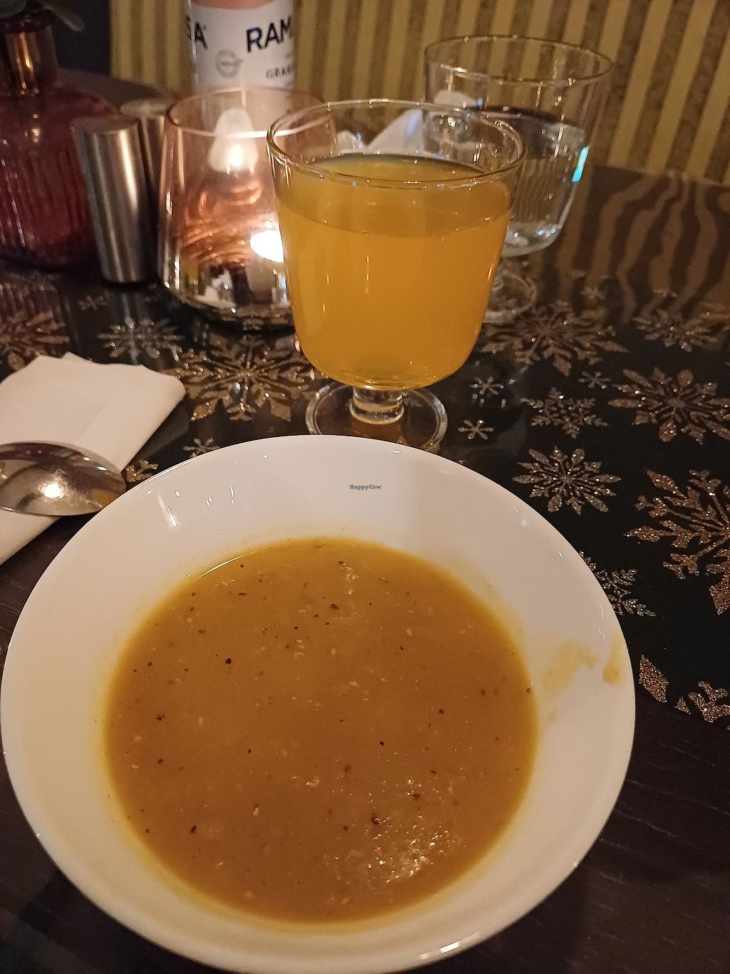 Soup made of lentils, carrots and ginger included. And lemon sliced water.